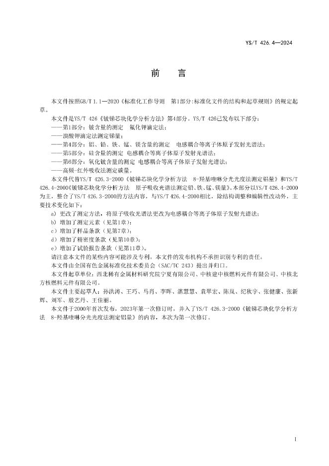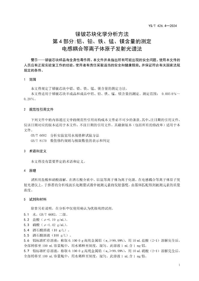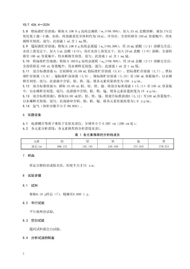 YS/T 426.4-2024 锑铍芯块化学分析方法 第4部分:铝、铅、铁、锰、镁含量的测定 电感耦合等离子体原子发射光谱法