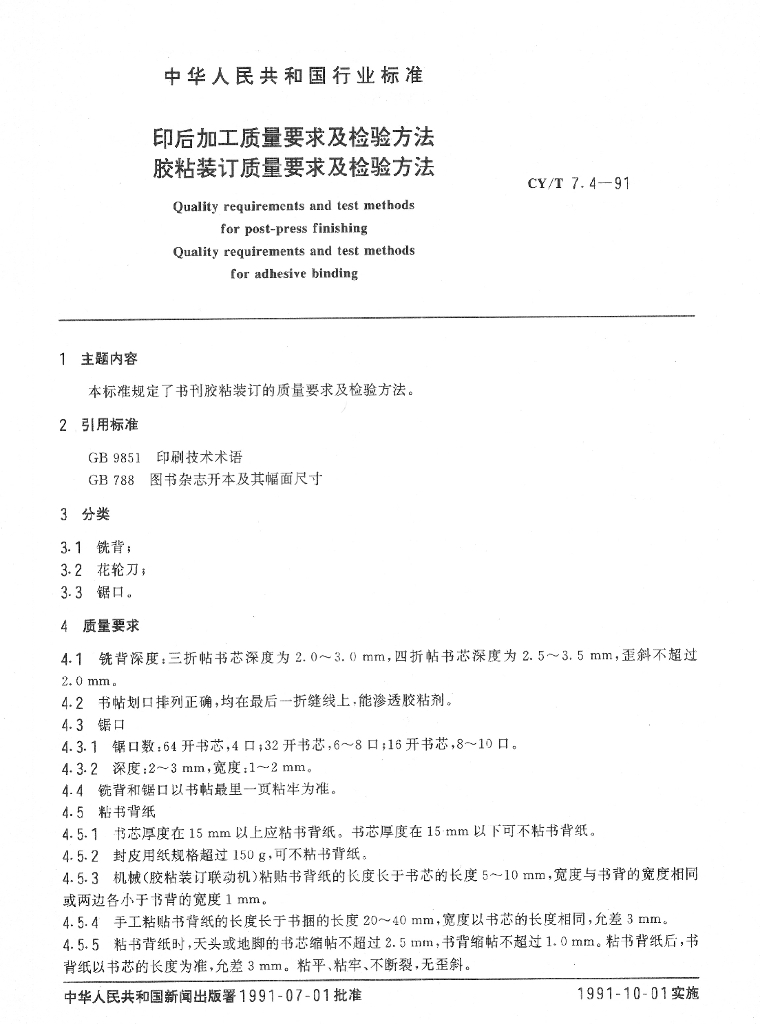 CY/T 7.4-1991 印后加工质量要求及检验方法 胶粘装订质量要求及检验方法