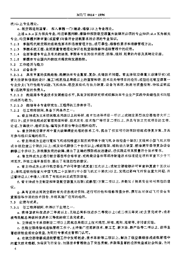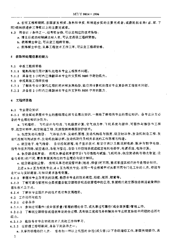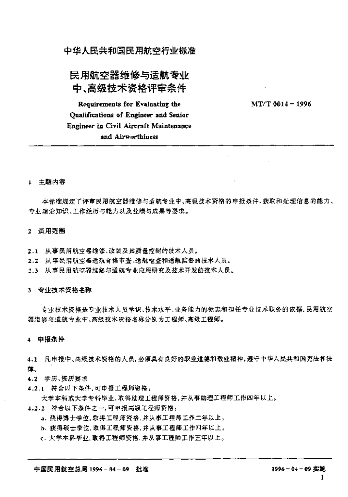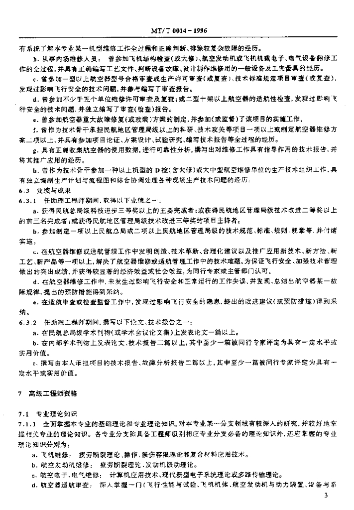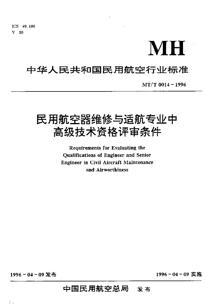 MH/T 0014-1996 民用航空器维修与适航专业中高级技术资格评审条件