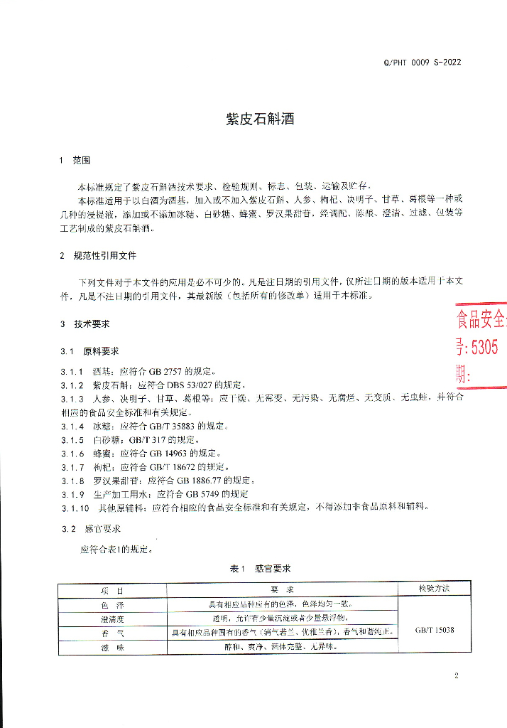 Q/PHT 0009S-2022 紫皮石斛酒