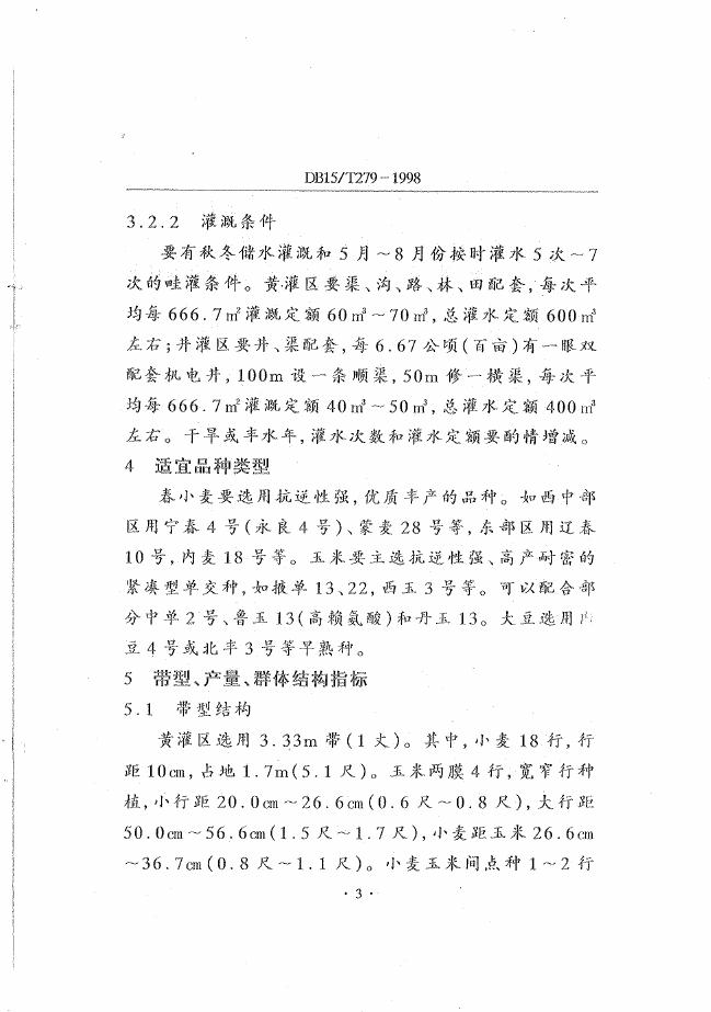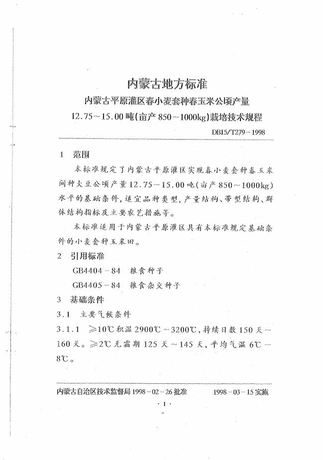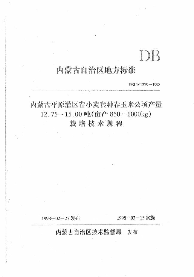 DB15/T 279-1998 内蒙古平原灌区春小麦套种春玉米公顷产量12.75-15.00吨(亩产850-1000kg)栽培技术规程