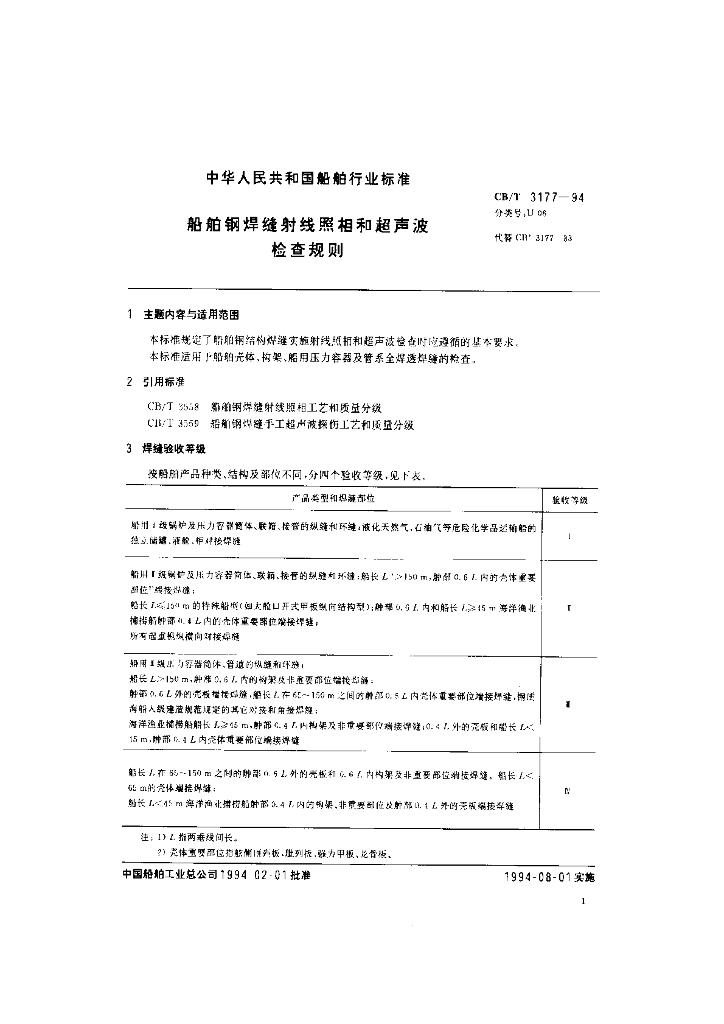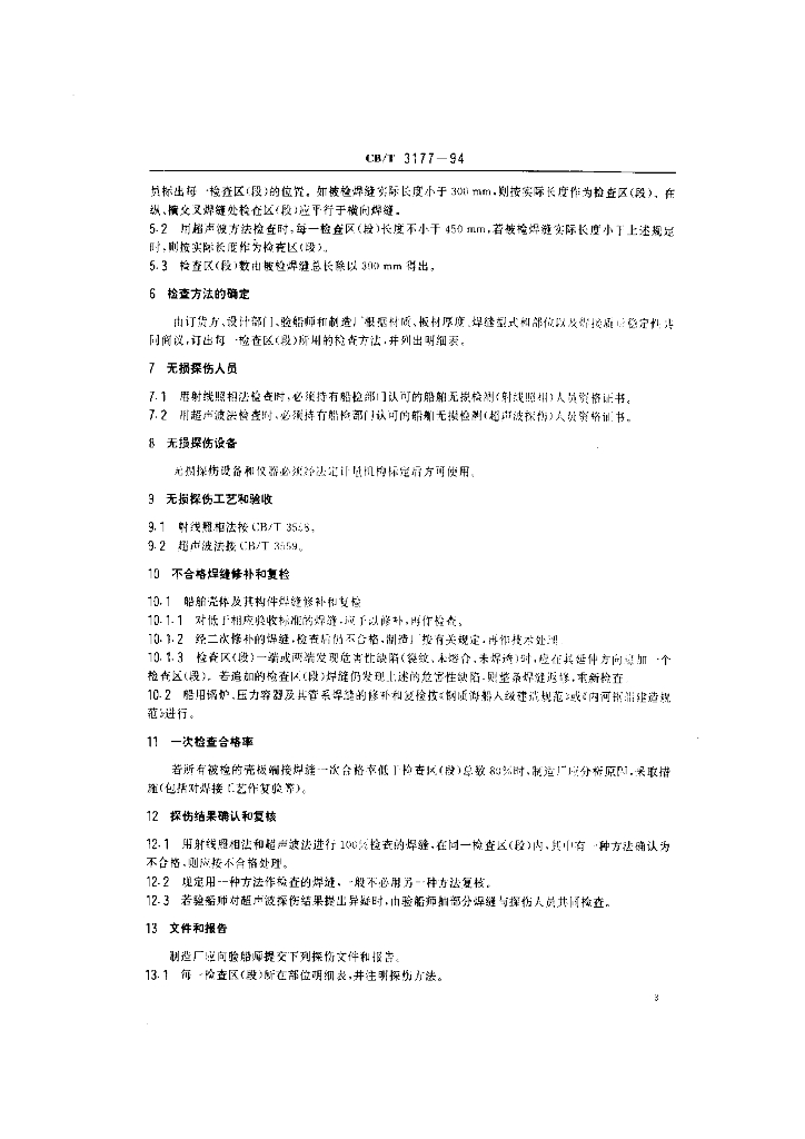 CB/T 3177-1994 船舶钢焊缝射线照相和超声波检查规则