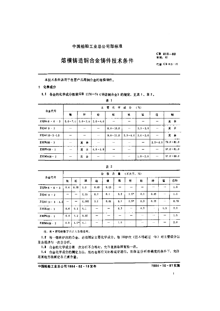 CB 815-1983 熔模铸造铜合金铸件技术条件