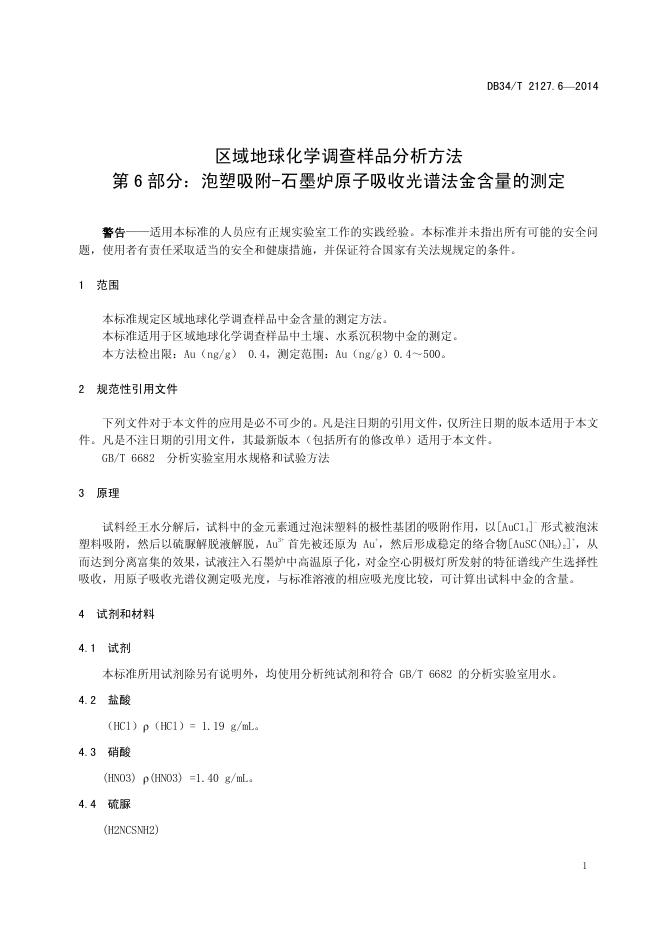 DB34/T 2127.6-2014 区域地球化学调查样品分析方法 第6部分:泡塑吸附-石墨炉原子吸收光谱法金含量的测定