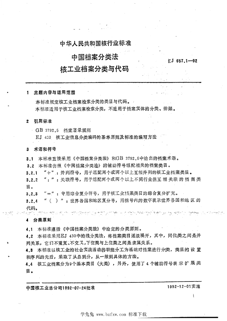 EJ 657.1-1992 中国档案分类法核工业档案分类与代码
