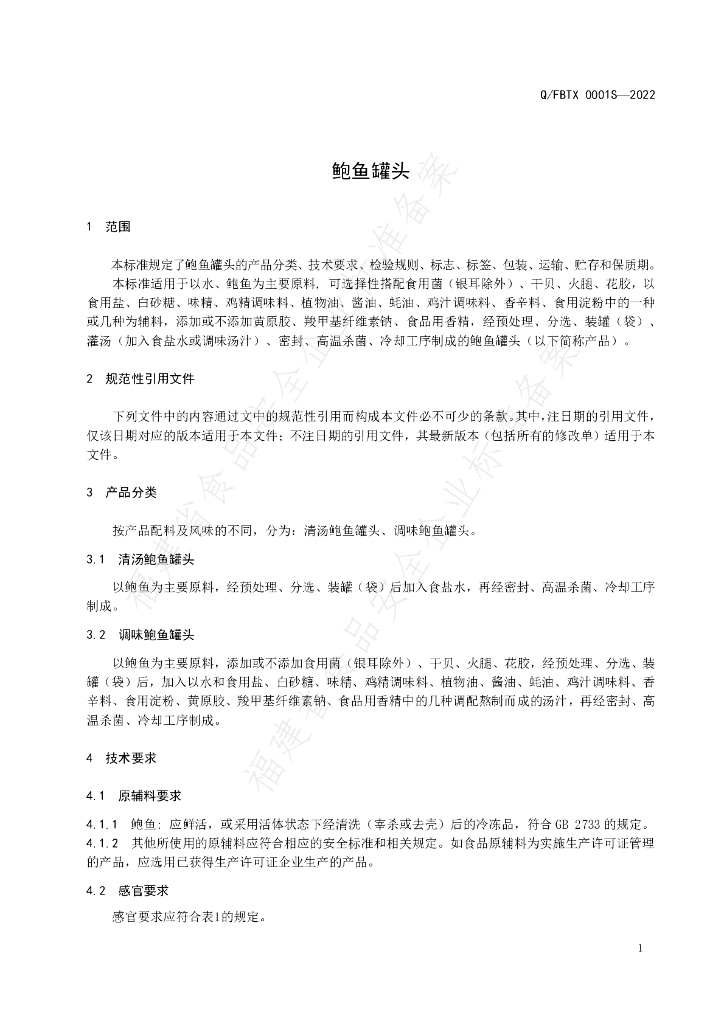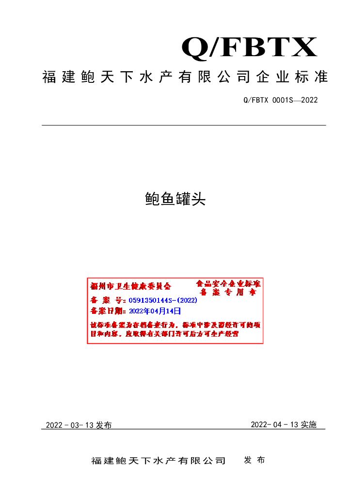 Q/FBTX 0001S-2022 鲍鱼罐头