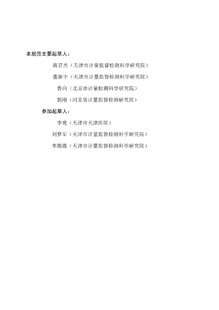 蒋君杰(天津市计量监督检测科学研究院)、董新宇(天津市计量监督检测科学研究院)、鲁向(北京市计量检测科学研究院)、郭刚(河北省计量监督检测研究院)、李爽(天津市天津医院)、刘梦军(天津市计量监督检测科学研究院)、李微微(天津市计量监督检测科学研究院)