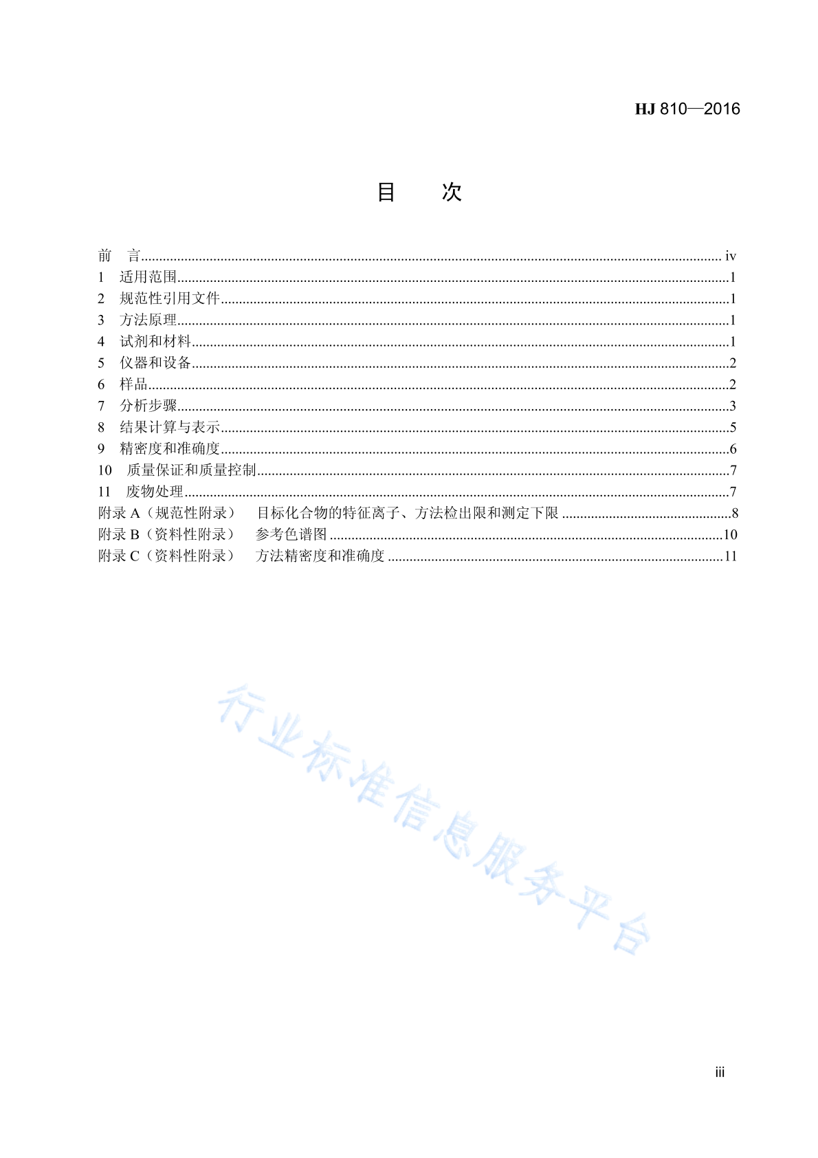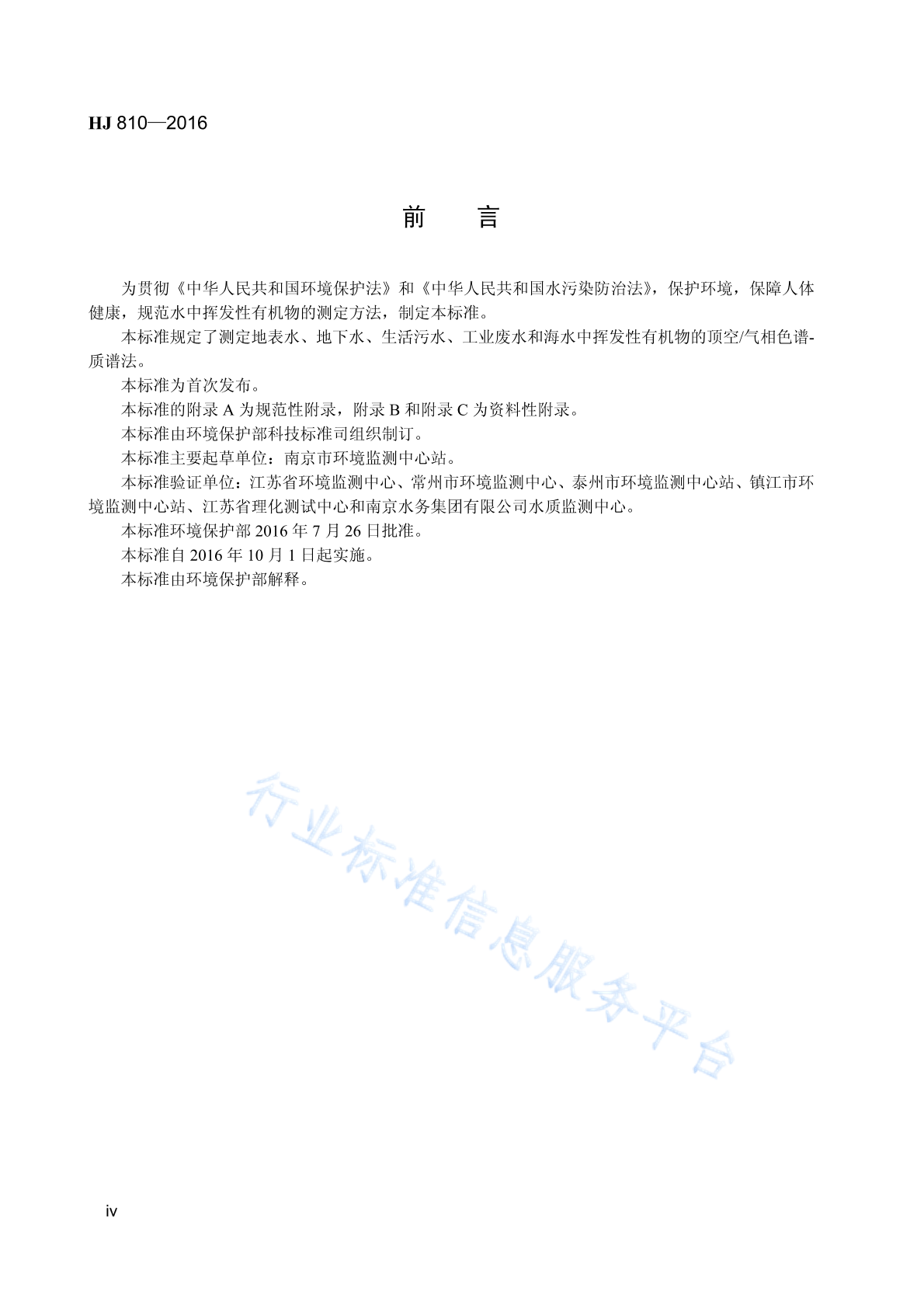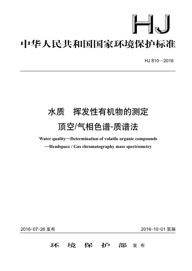 HJ 810-2016 水质 挥发性有机物的测定 顶空/气相色谱-质谱法