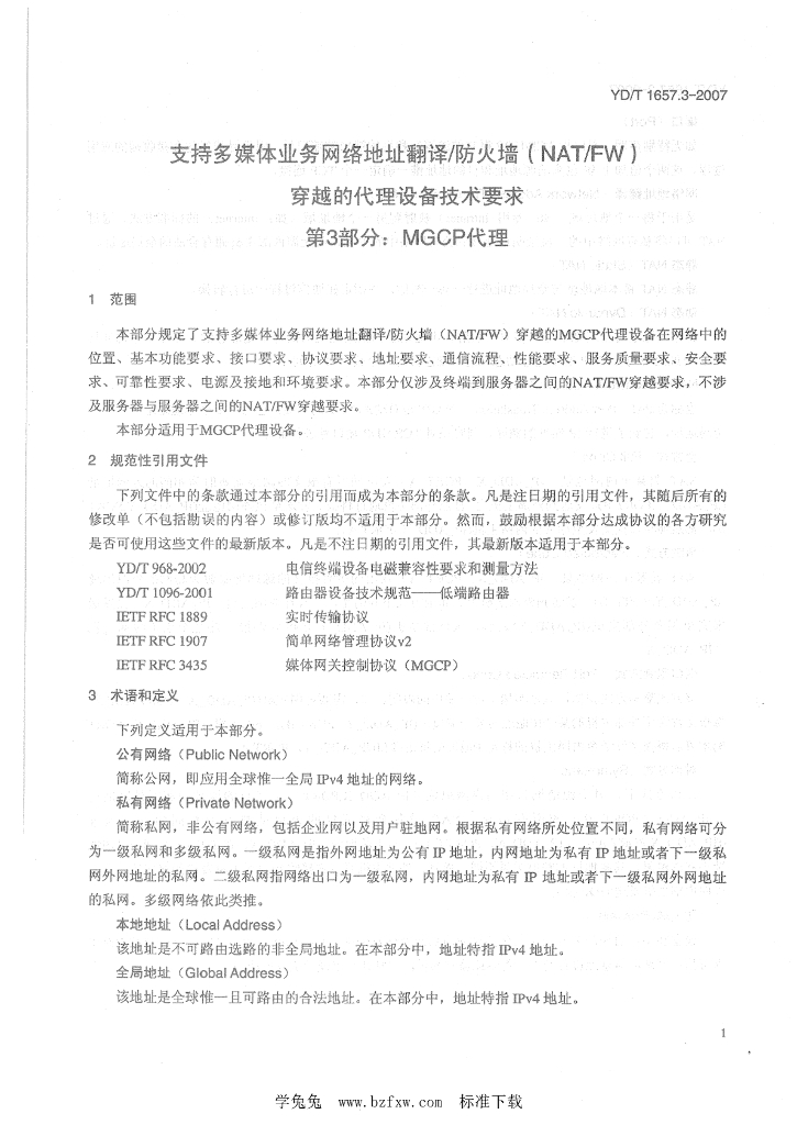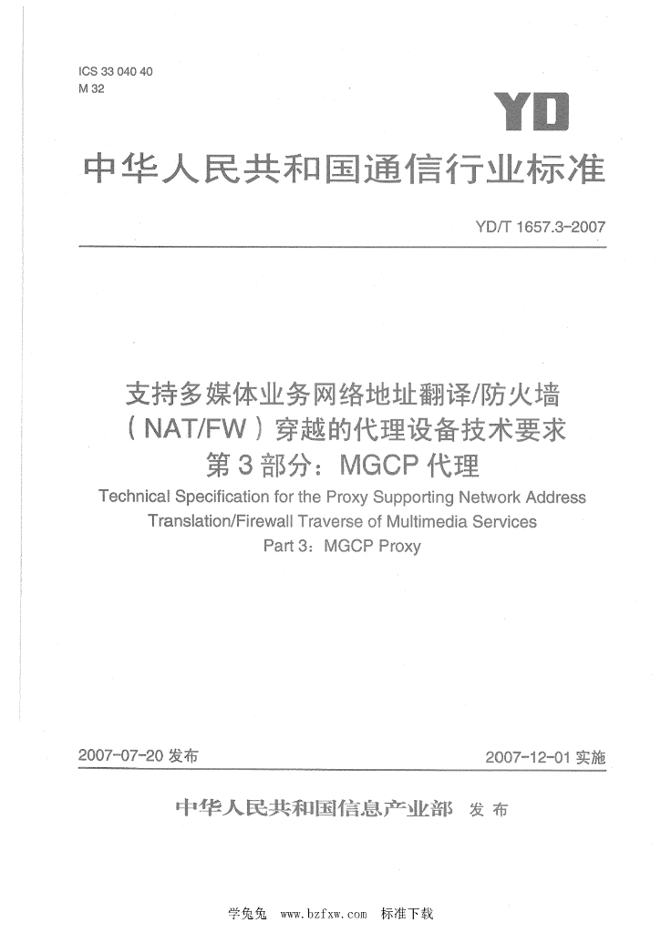 YD/T 1657.3-2007 支持多媒体业务网络地址翻译防火墙(NATFW)穿越的代理设备技术要求 第3部分:MGCP代理