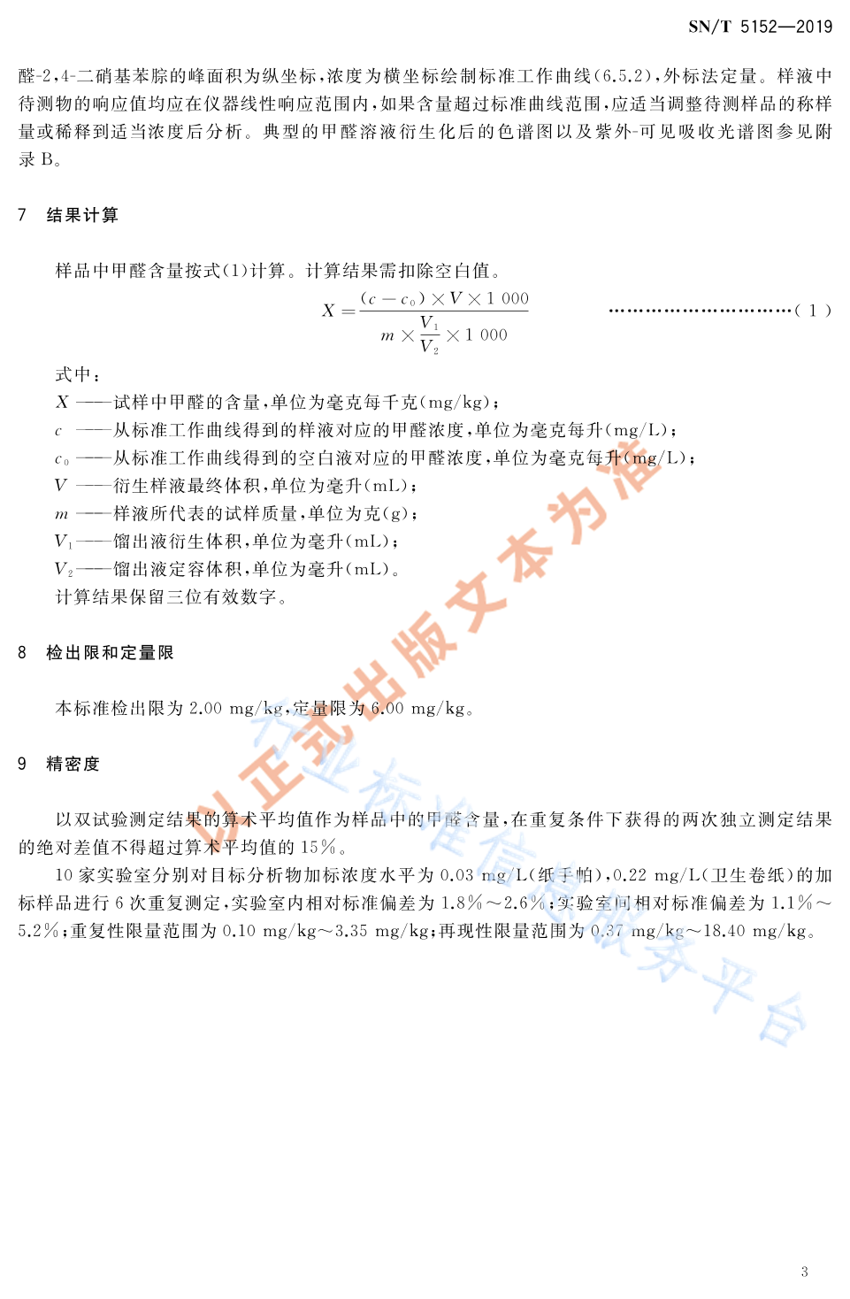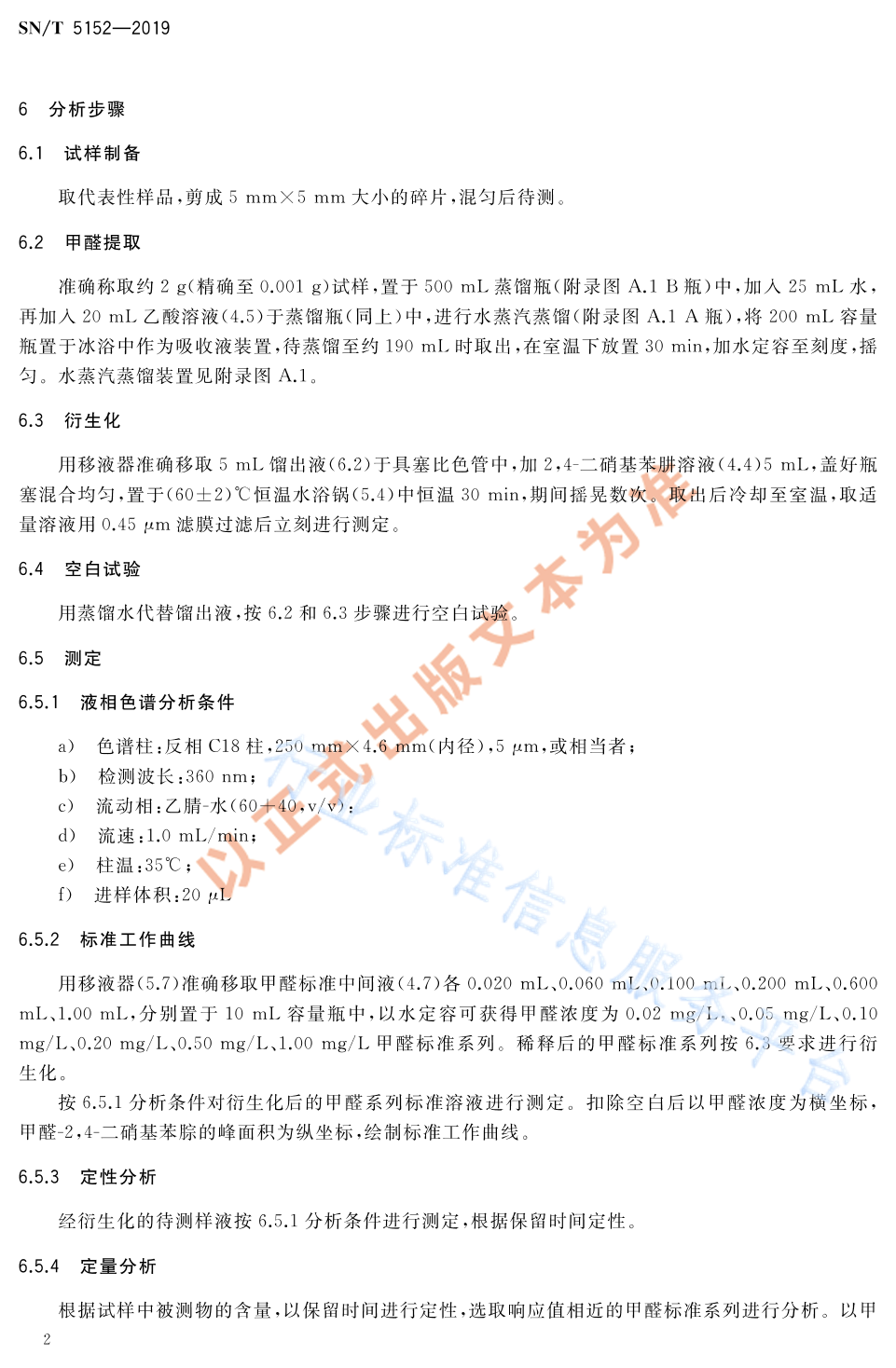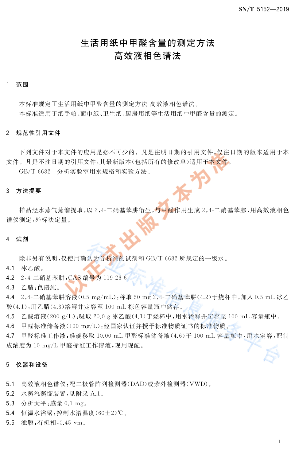 SN/T 5152-2019 生活用纸中甲醛含量的测定方法 高效液相色谱法