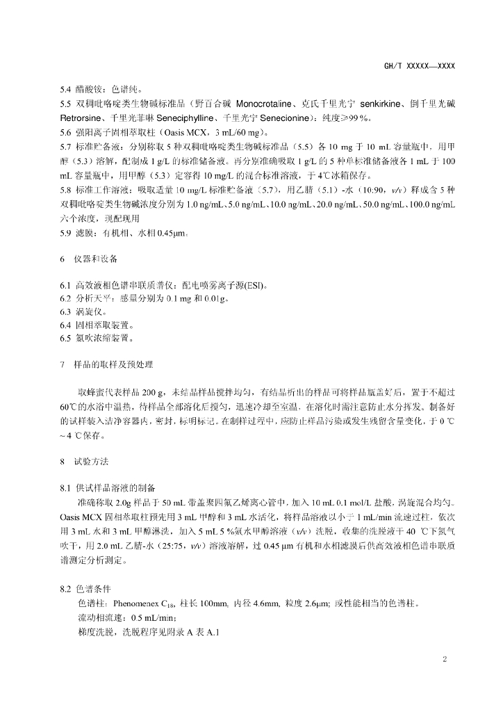 GH/T 1107-2015 蜂蜜中5种双稠吡咯啶类生物碱的测定 高效液相色谱-质谱/质谱法