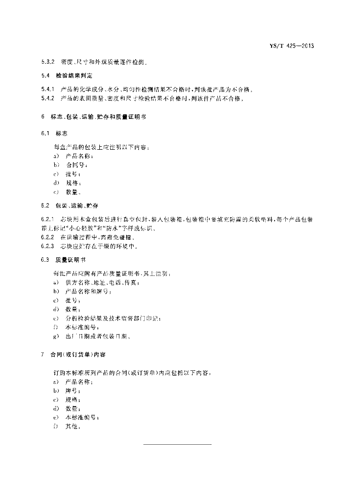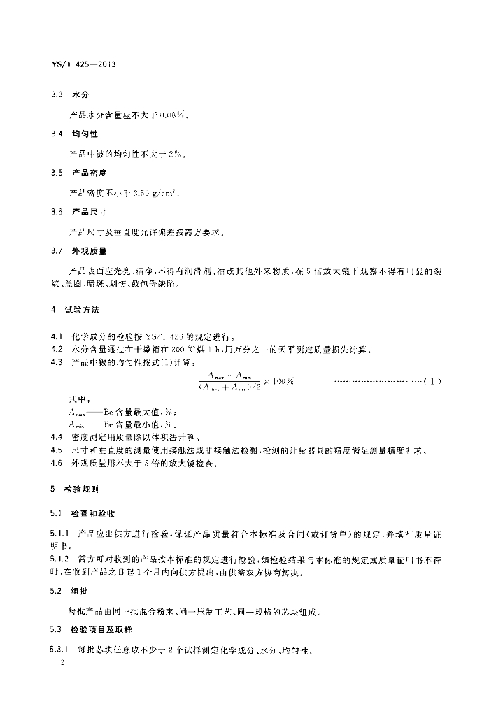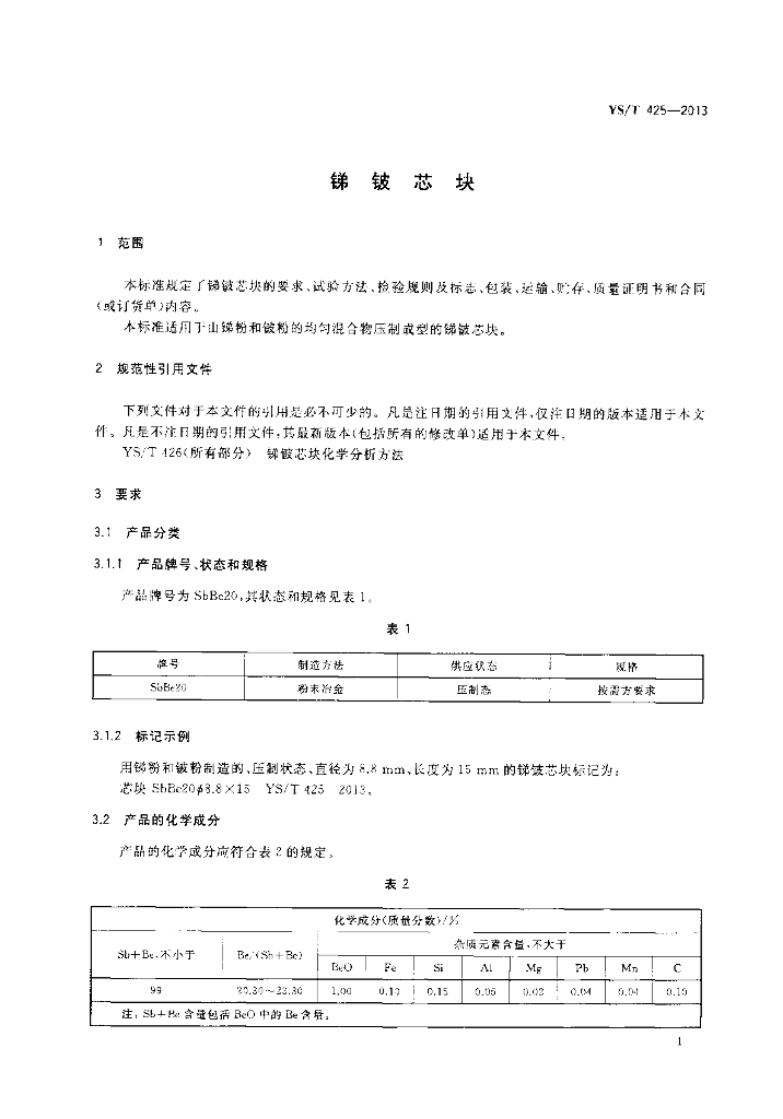 YS/T 425-2013 锑铍芯块