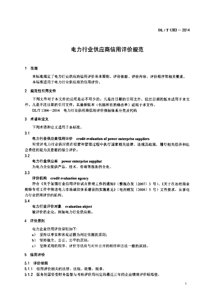 DL/T 1383-2014 电力行业供应商信用评价规范