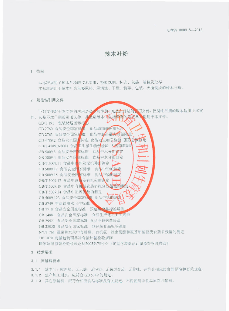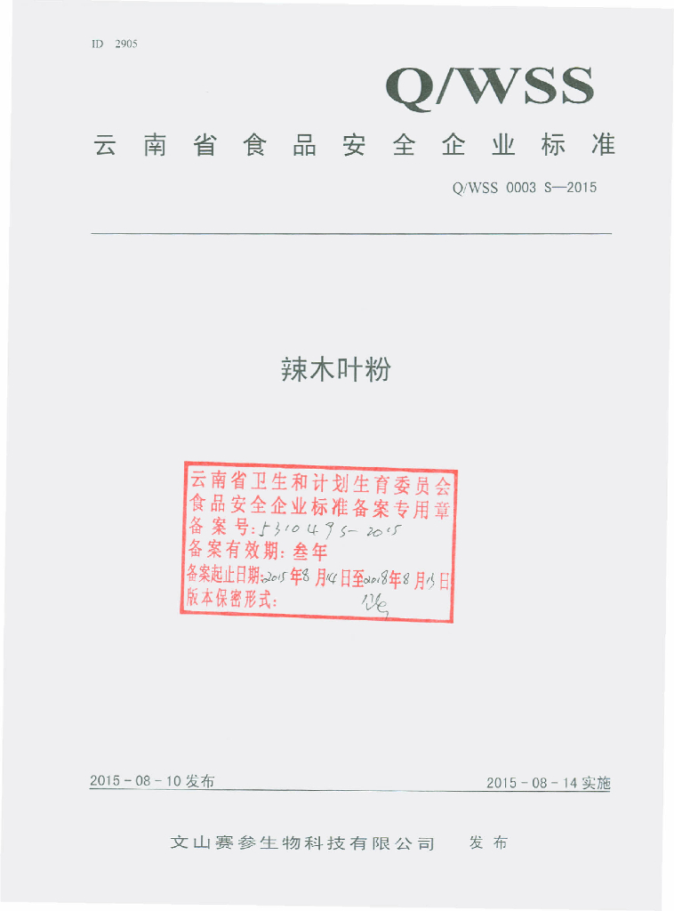 Q/WSS 0003S-2015 文山赛参生物科技有限公司 辣木叶粉
