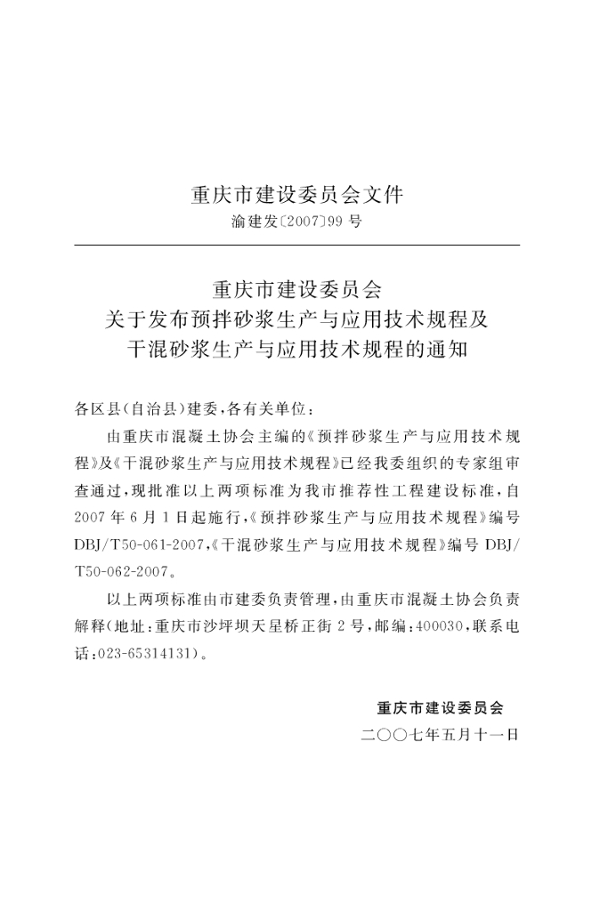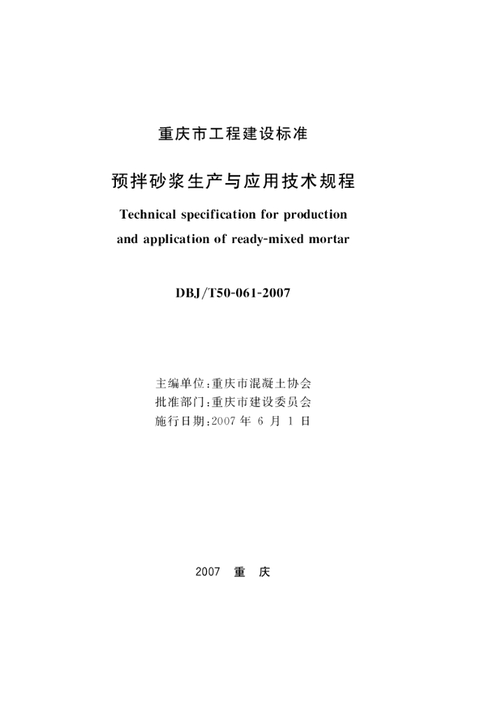 DBJ/T 50-061-2007 预拌砂浆生产与应用技术规程