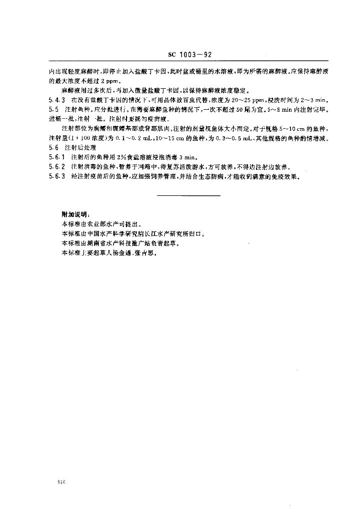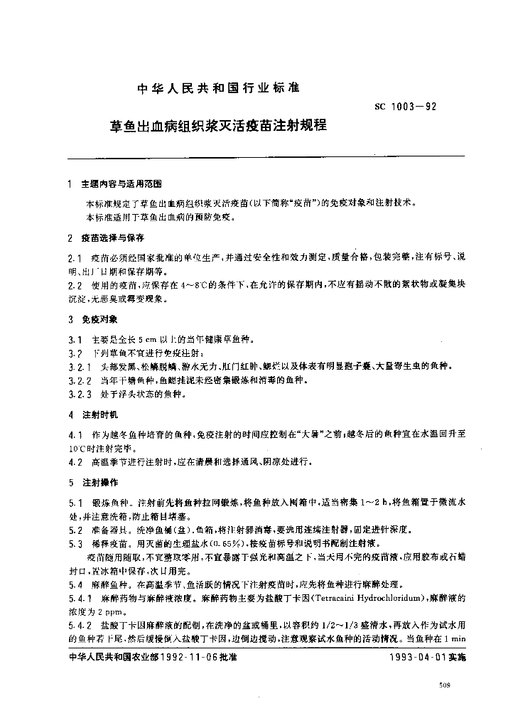 SC 1003-1992 草鱼出血病组织浆灭活疫苗注射规程