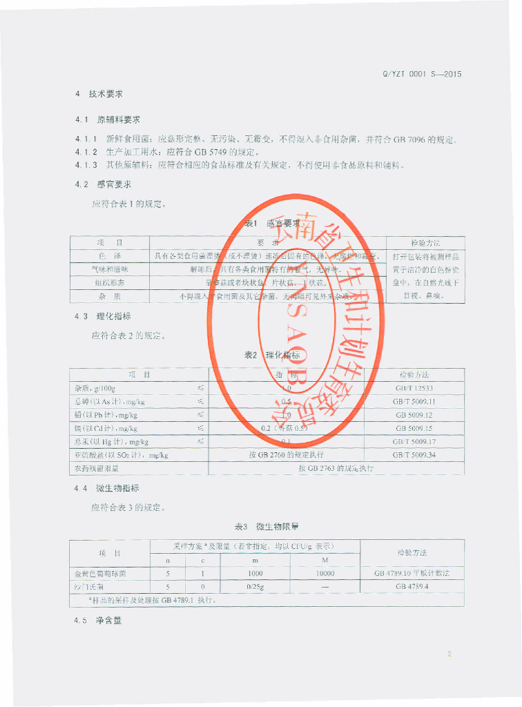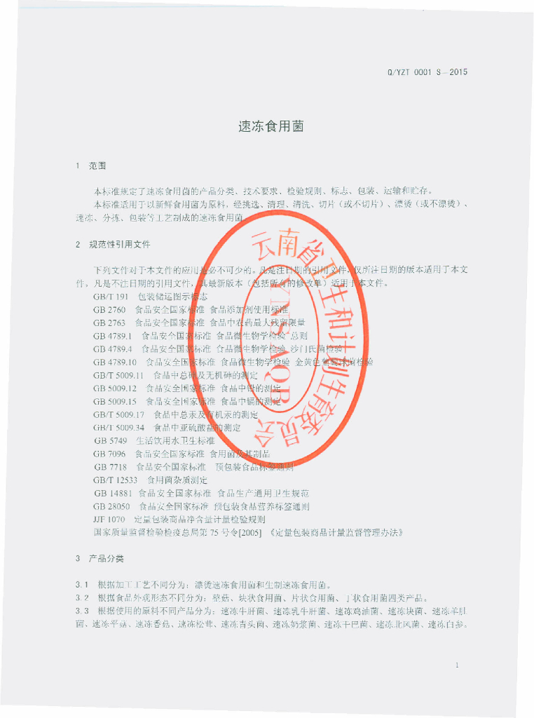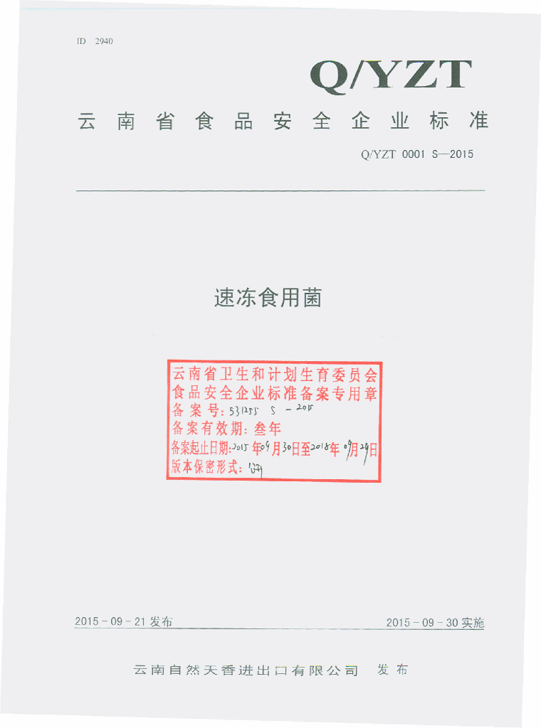 Q/YZT 0001S-2015 云南自然天香进出口有限公司 速冻食用菌