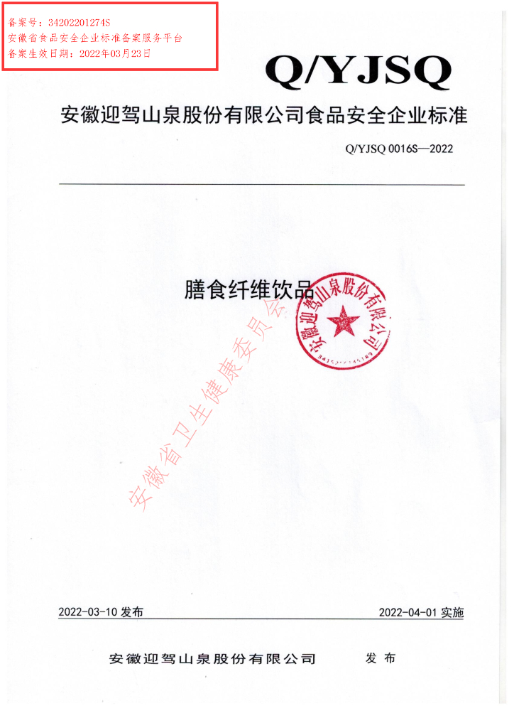 Q/YJSQ 0016S-2022 膳食纤维饮品