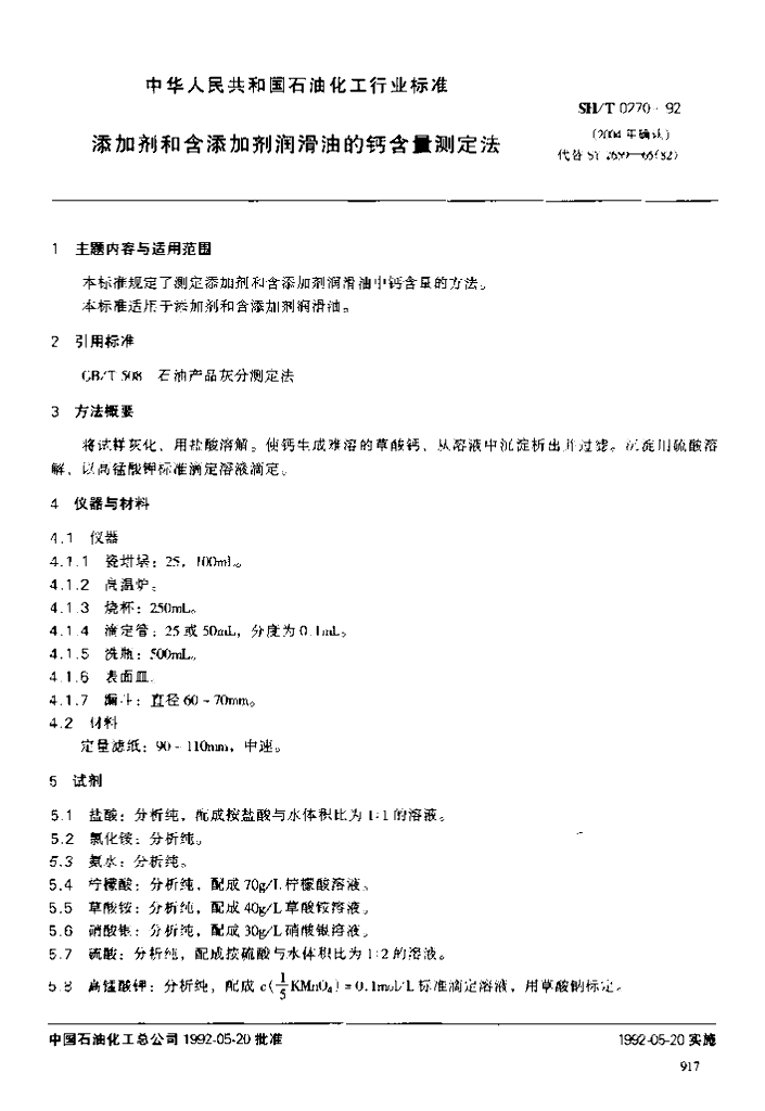 SH/T 0270-1992 添加剂和含添加剂润滑油的钙含量测定法
