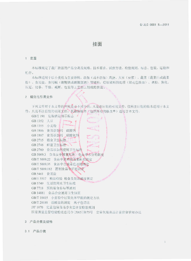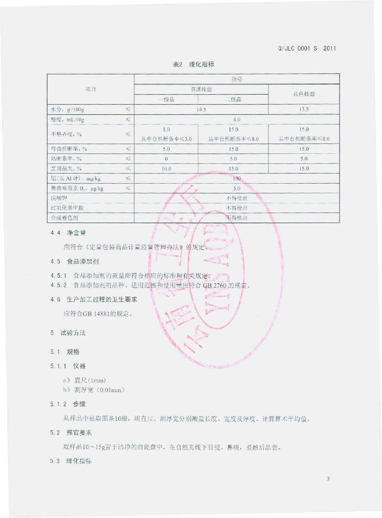 Q/JLC 0001S-2011 挂面