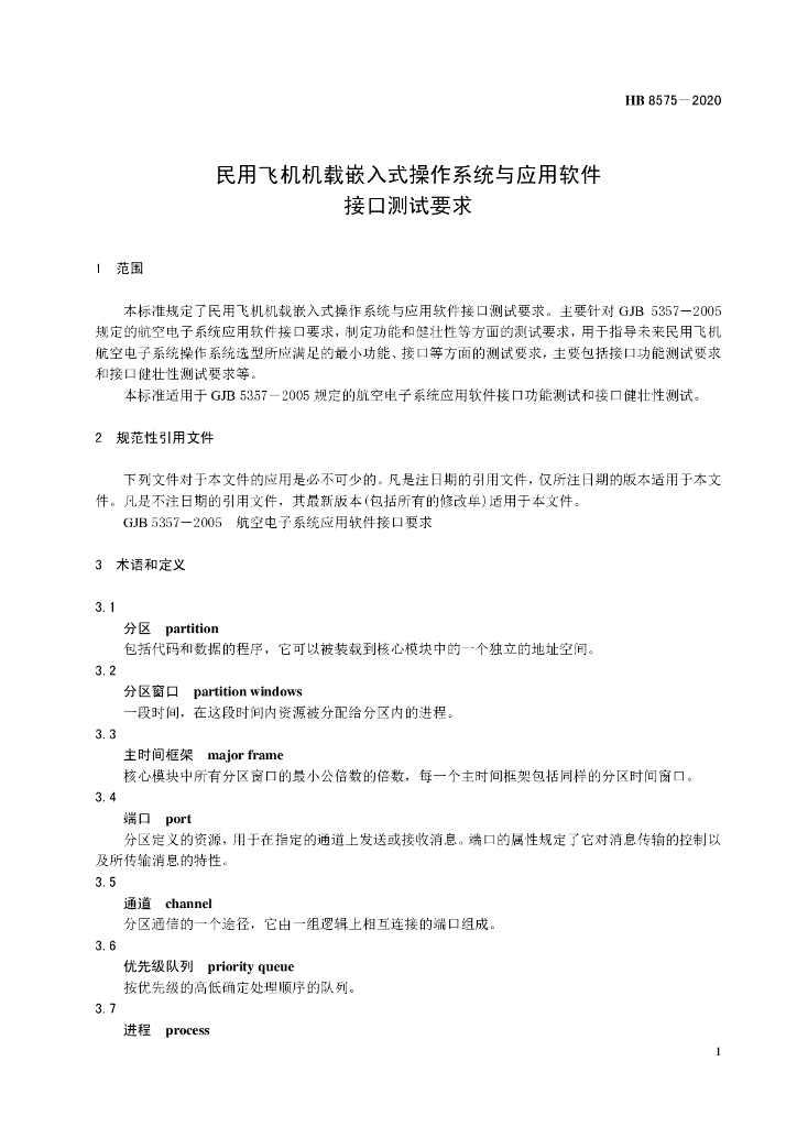 HB 8575-2020 民用飞机机载嵌入式操作系统与应用软件接口测试要求