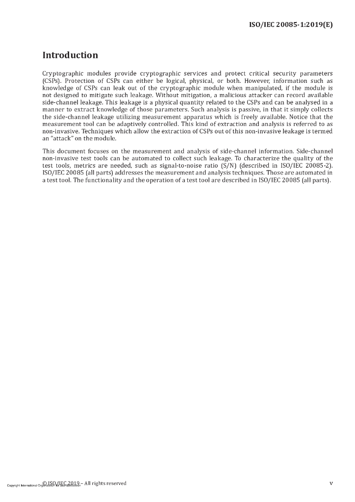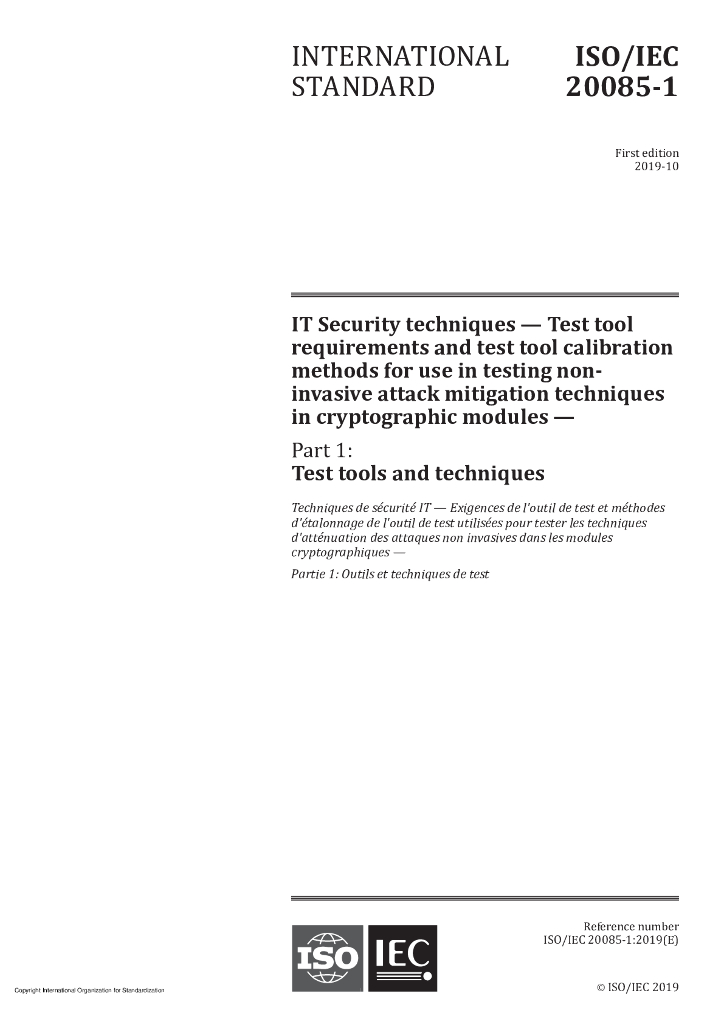 ISO/IEC 20085-1-2019 信息安全技术 用于测试密码模块中的非侵入性攻击缓解技术的测试工具要求和测试工具校准方法 第1部分:测试工具和技术