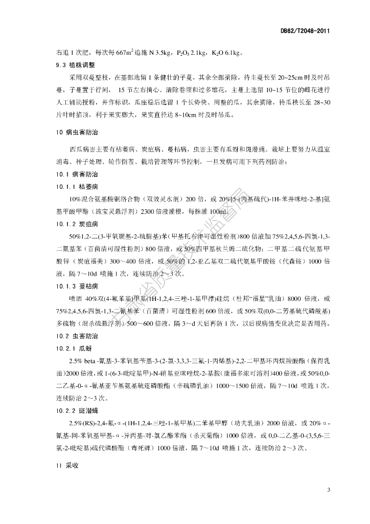 DB62/T 2048-2011 日光温室蔬菜基质栽培 西瓜生产技术规程