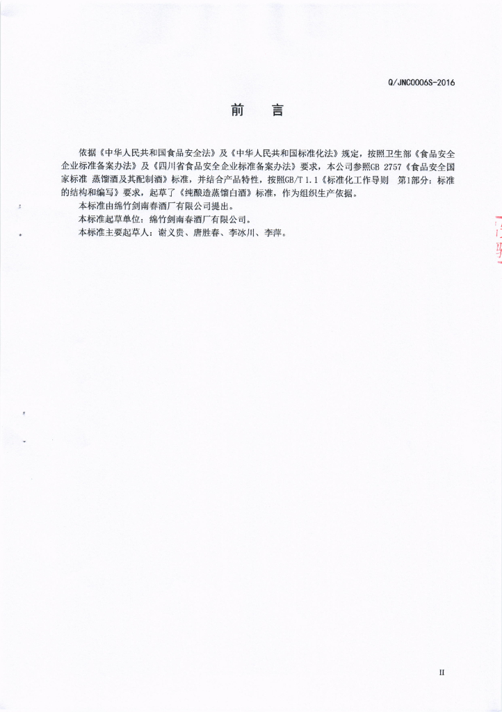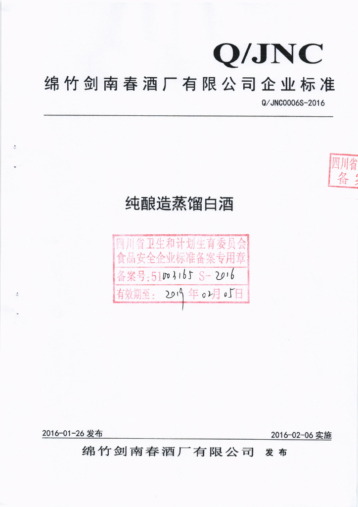 Q/JNC 0006S-2016 绵竹剑南春酒厂有限公司 纯酿造蒸馏白酒