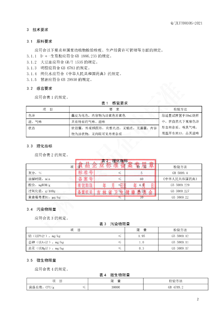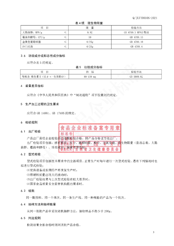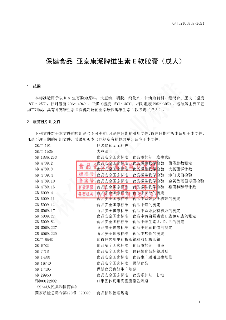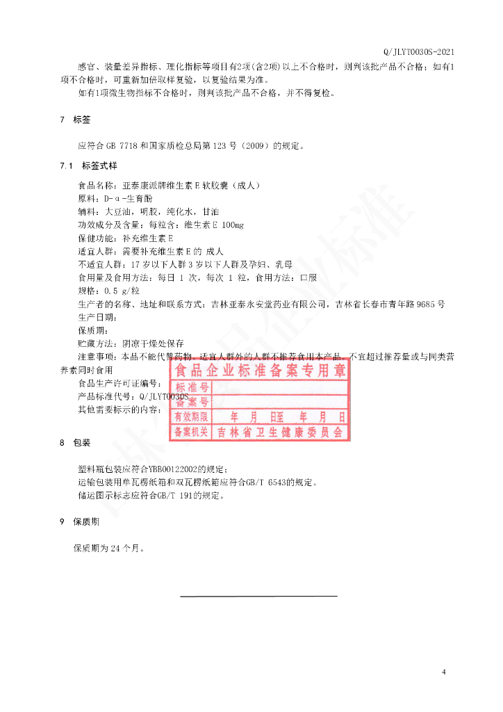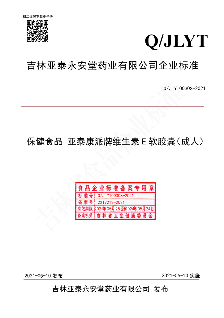 Q/JLYT 0030S-2021 保健食品 亚泰康派牌维生素E软胶囊(成人)