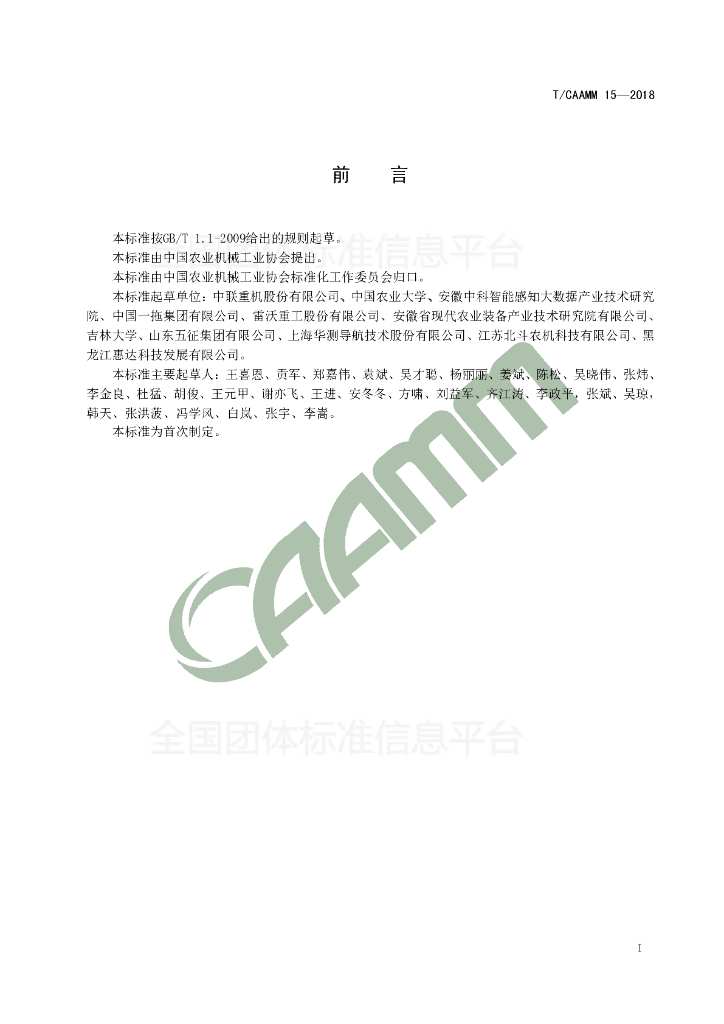 中联重机股份有限公司、中国农业大学、安徽中科智能感知大数据产业技术研究院、中国一拖集团有限公司、雷沃重工股份有限公司、安徽省现代农业装备产业技术研究院有限公司、吉林大学、山东五征集团有限公司、上海华测导航技术股份有限公司、江苏北斗农机科技有限公司、黑龙江惠达科技发展有限公司