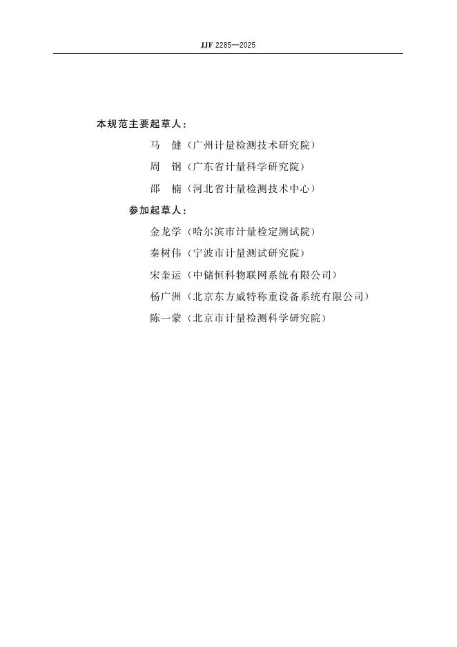 马健(广州计量检测技术研究院);周钢(广东省计量科学研究院);邵楠(河北省计量检测技术中心);金龙学(哈尔滨市计量检定测试院);秦树伟(宁波市计量测试研究院);宋奎运(中储恒科物联网系统有限公司);杨广洲(北京东方威特称重设备系统有限公司);陈一蒙(北京市计量检测科学研究院)