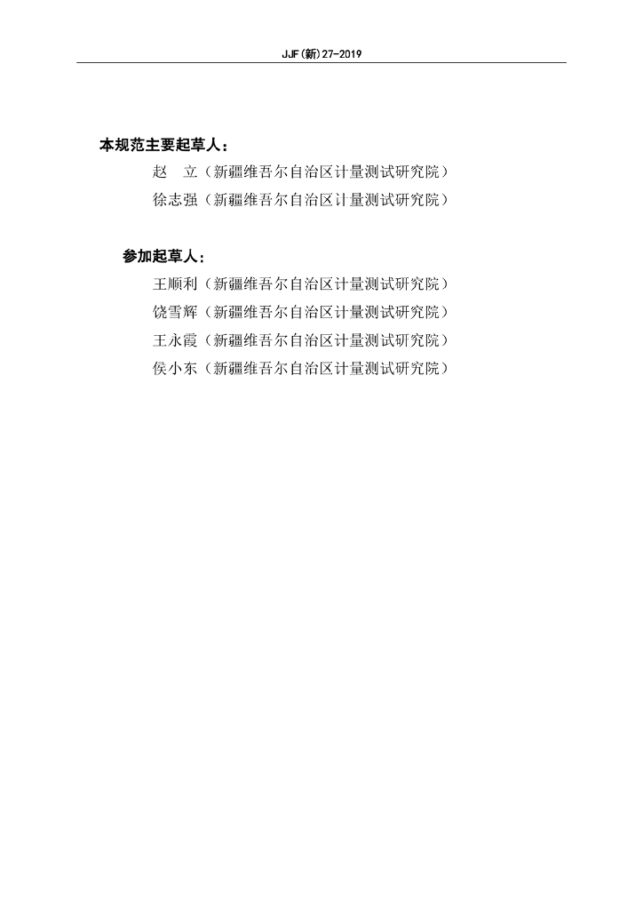 赵立(新疆维吾尔自治区计量测试研究院)、徐志强(新疆维吾尔自治区计量测试研究院)、王顺利(新疆维吾尔自治区计量测试研究院)、饶雪辉(新疆维吾尔自治区计量测试研究院)、王永霞(新疆维吾尔自治区计量测试研究院)、侯小东(新疆维吾尔自治区计量测试研究院)