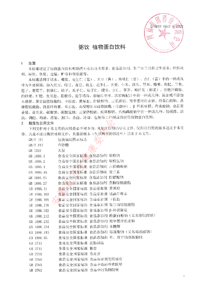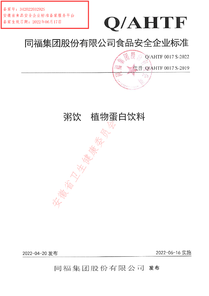 Q/AHTF 0017S-2022 粥饮植物蛋白饮料
