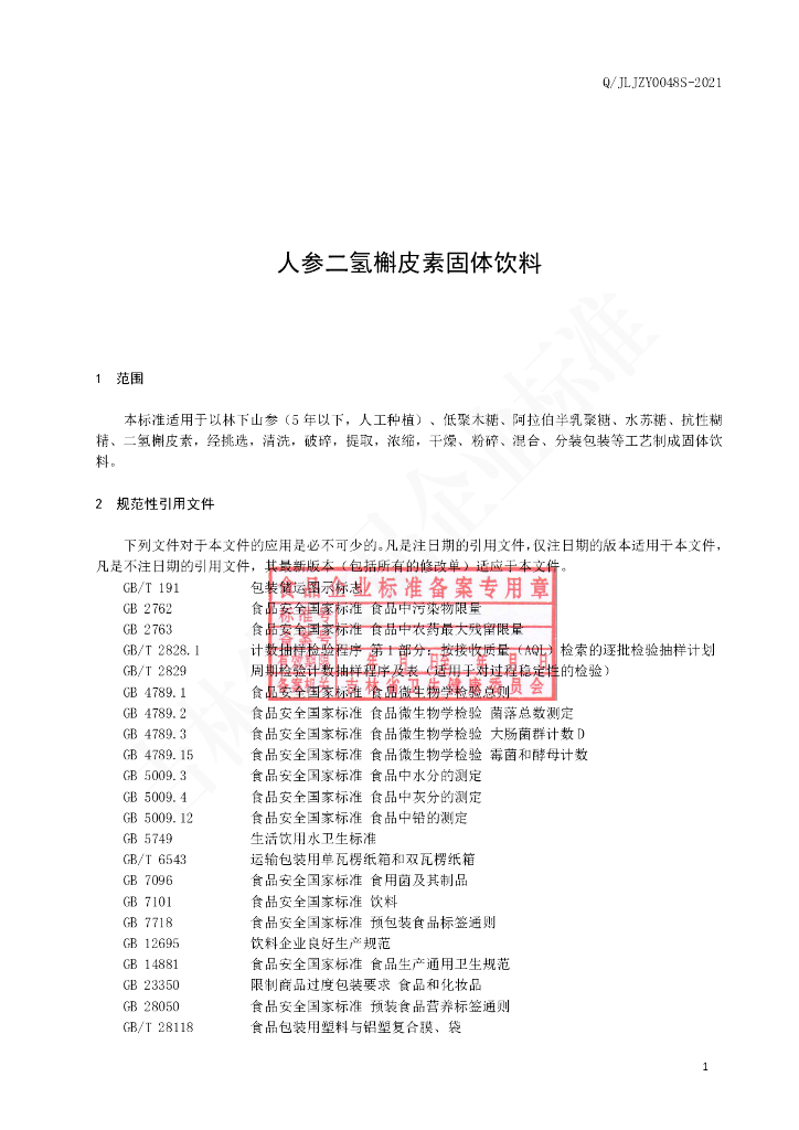 Q/JLJZY 0048S-2021 人参二氢槲皮素固体饮料
