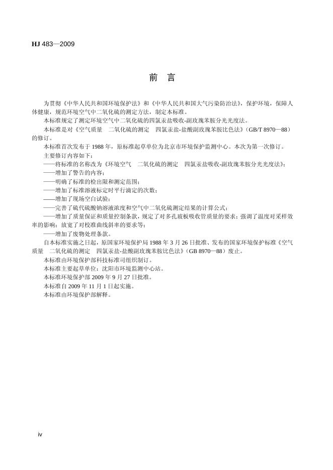 HJ 483-2009 环境空气 二氧化硫的测定 四氯汞盐吸收-副玫瑰苯胺分光光度法