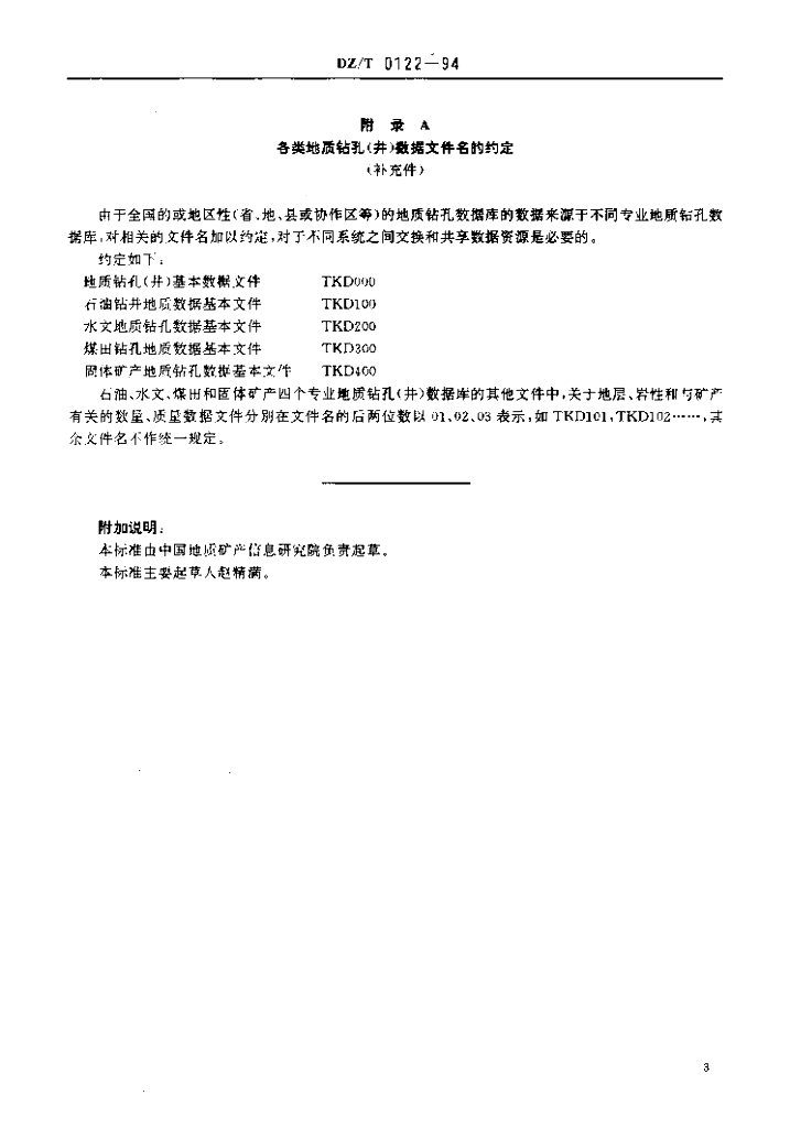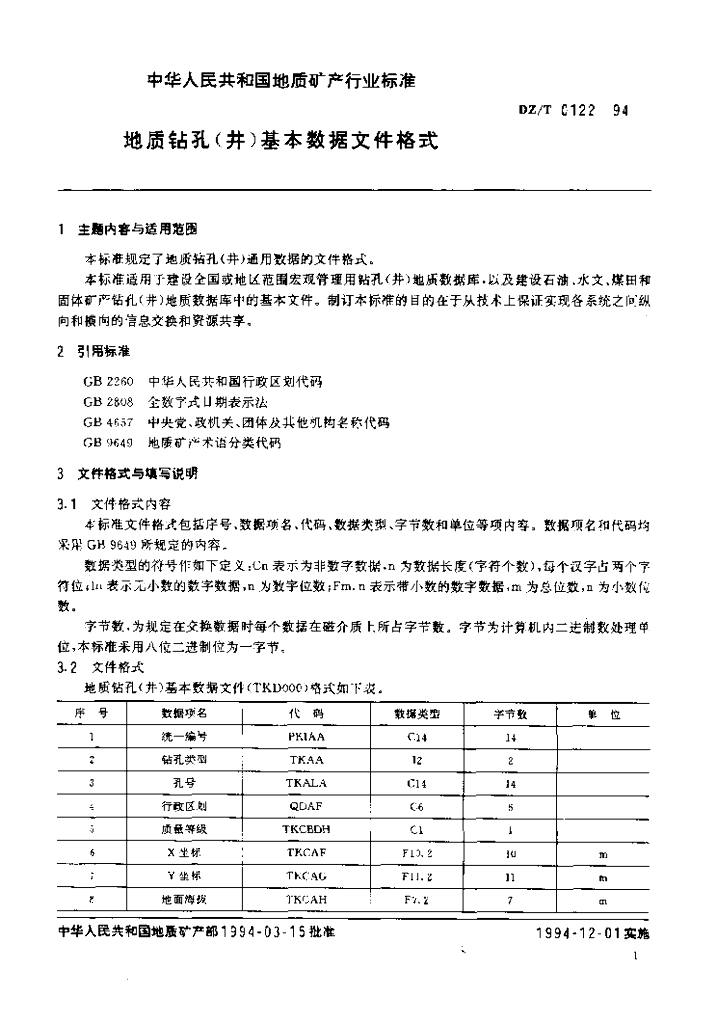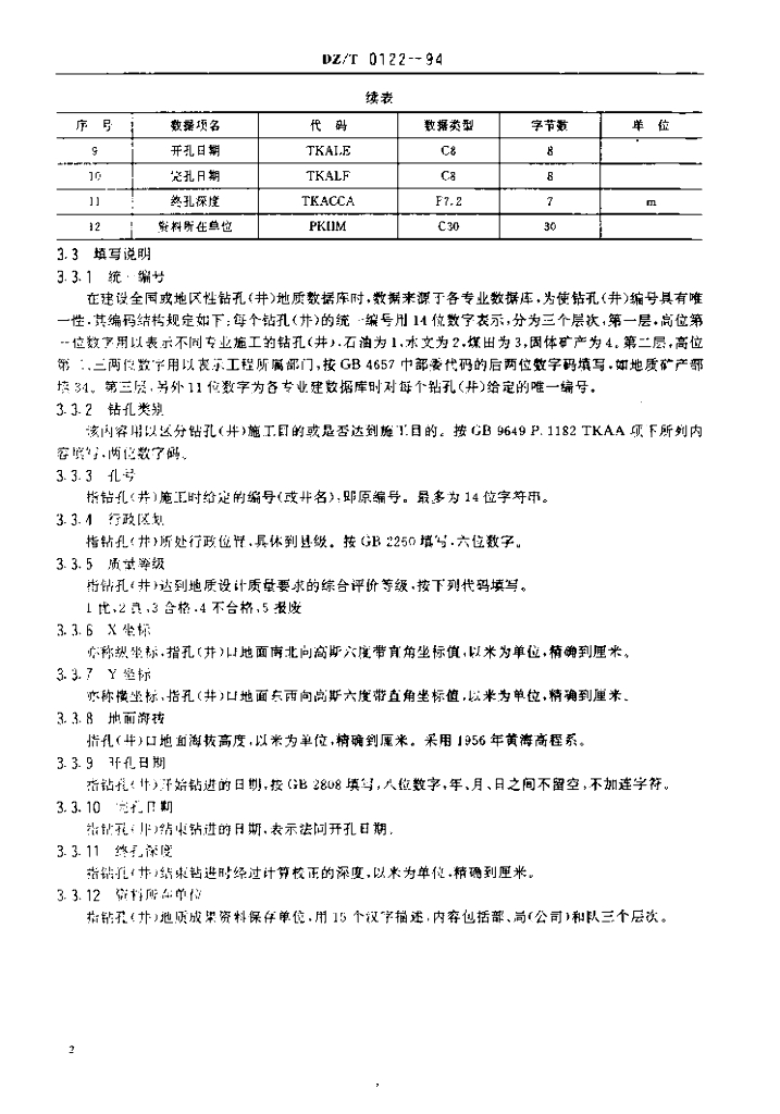 DZ/T 0122-1994 地质钻孔(井)基本数据文件格式