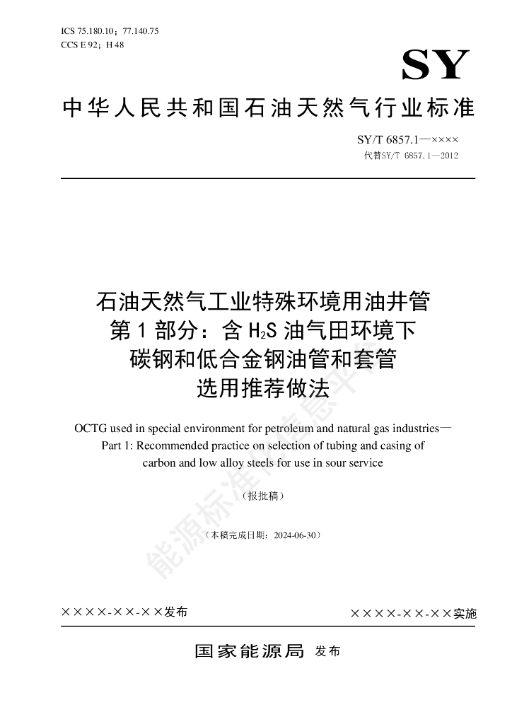 SY/T 6857.1-2024 石油天然气工业特殊环境用油井管 第1部分:含H2S油气田环境下 碳钢和低合金钢油管和套管选用推荐做法
