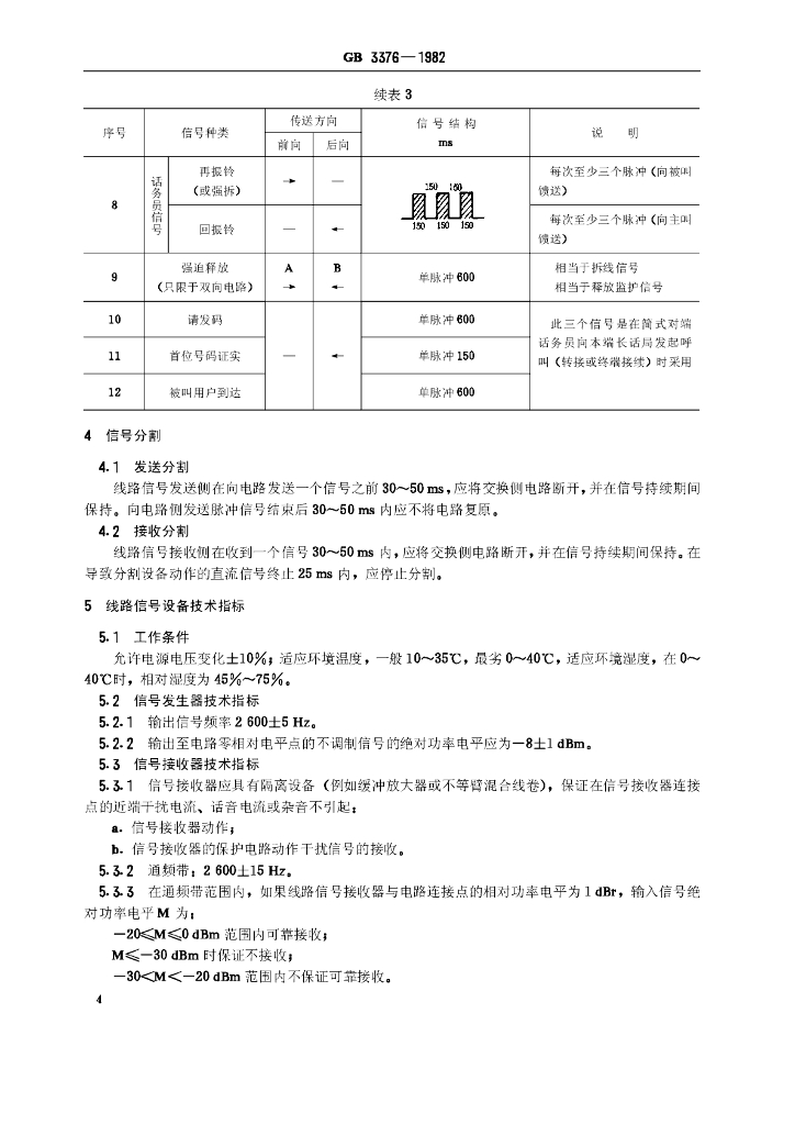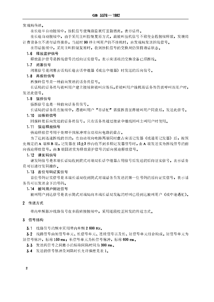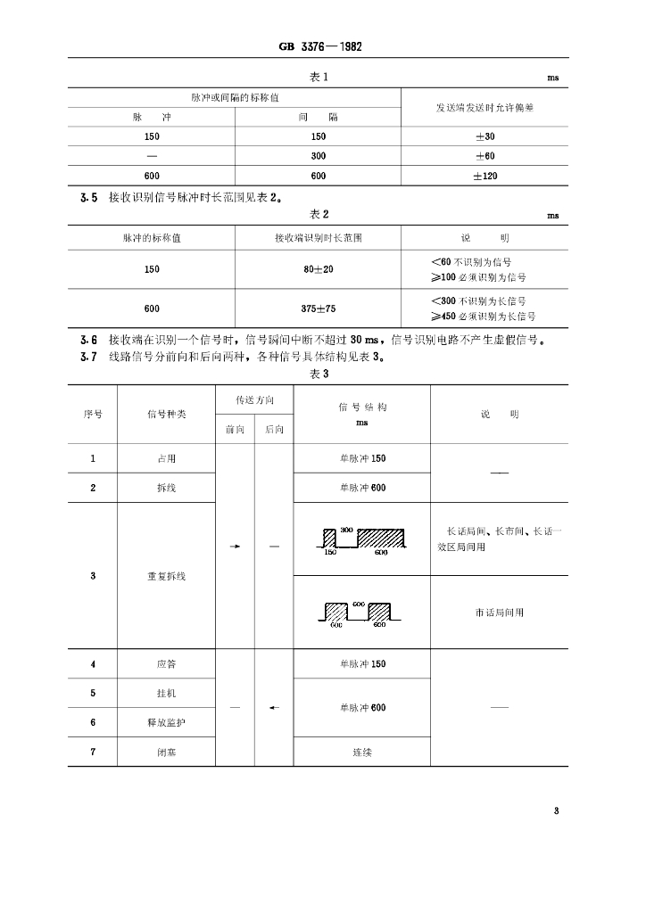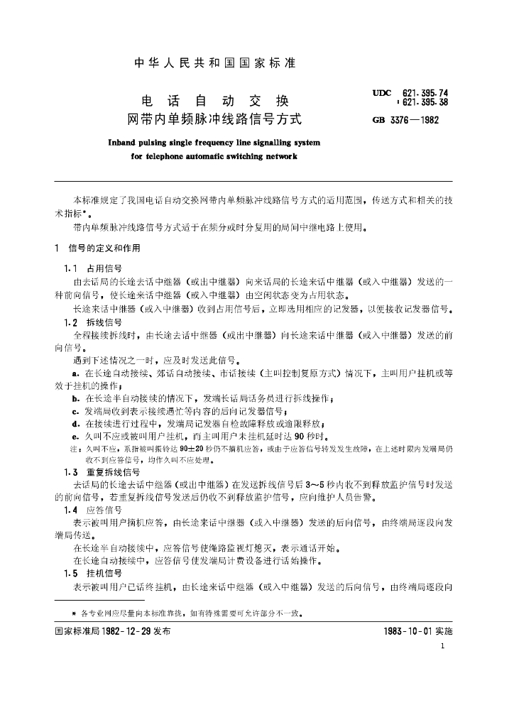 GB 3376-1982 电话自动交换网带内单频脉冲线路信号方式