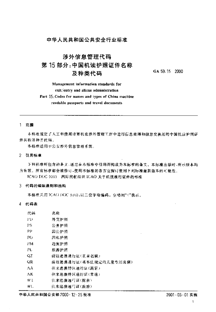GA 59.15-2000 涉外信息管理代码 第15部分:中国机读护照证件名称及种类代码