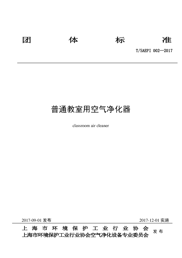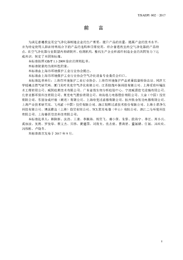 上海市环境保护工业行业协会、上海市环境保护产品质量监督检验总站、同济大学暖通及燃气研究所、厦门美时美克空气净化有限公司、江苏朗逸环保科技有限公司、上海爱启环境技术工程有限公司、威凯检测技术有限公司、广东省微生物分析检验中心、宁波威霖住宅设施有限公司、北京亚都环保科技有限公司、莱克电气股份有限公司、珠海格力电器股份有限公司、大金(中国)投资有限公司、东丽合成纤维(南通)有限公司、上海哈克过滤器有限公司、杭州钛合智造电器有限公司、上海产业技术研究院、飞利浦(中国)投资有限公司、浙江朝晖过滤技术股份有限公司、上