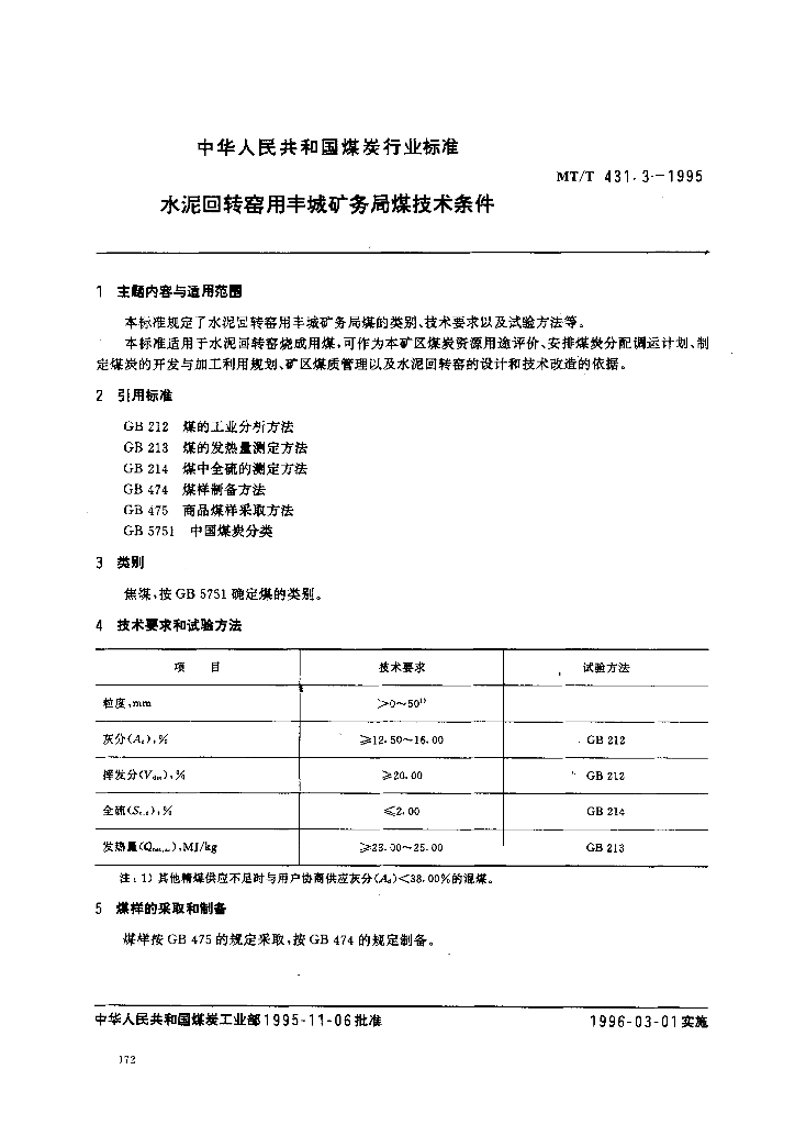 MT/T 431.3-1995 水泥回转窑用丰城矿务局煤技术条件