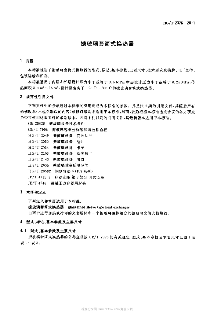 HG/T 2376-2011 代替 HG/T 2376-1992 搪玻璃套筒式换热器