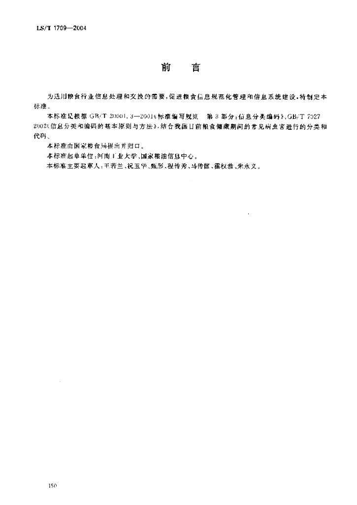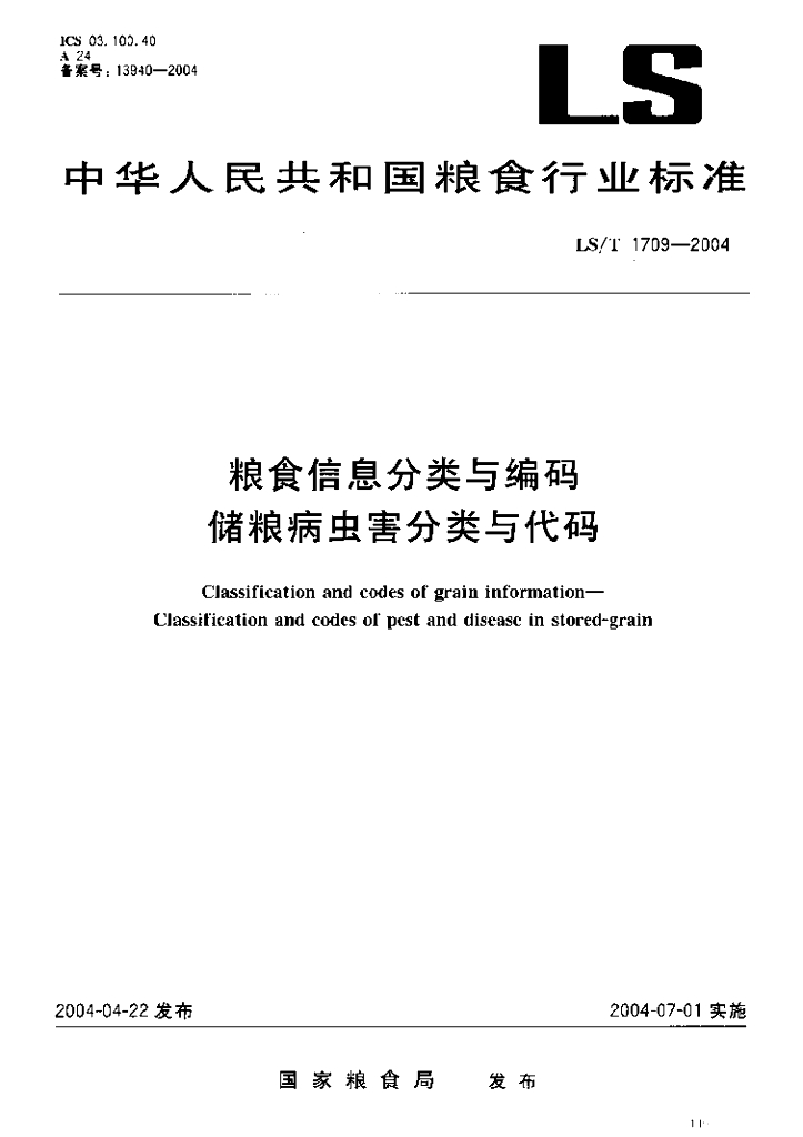LS/T 1709-2004 粮食信息分类与编码 储粮病虫害分类与代码