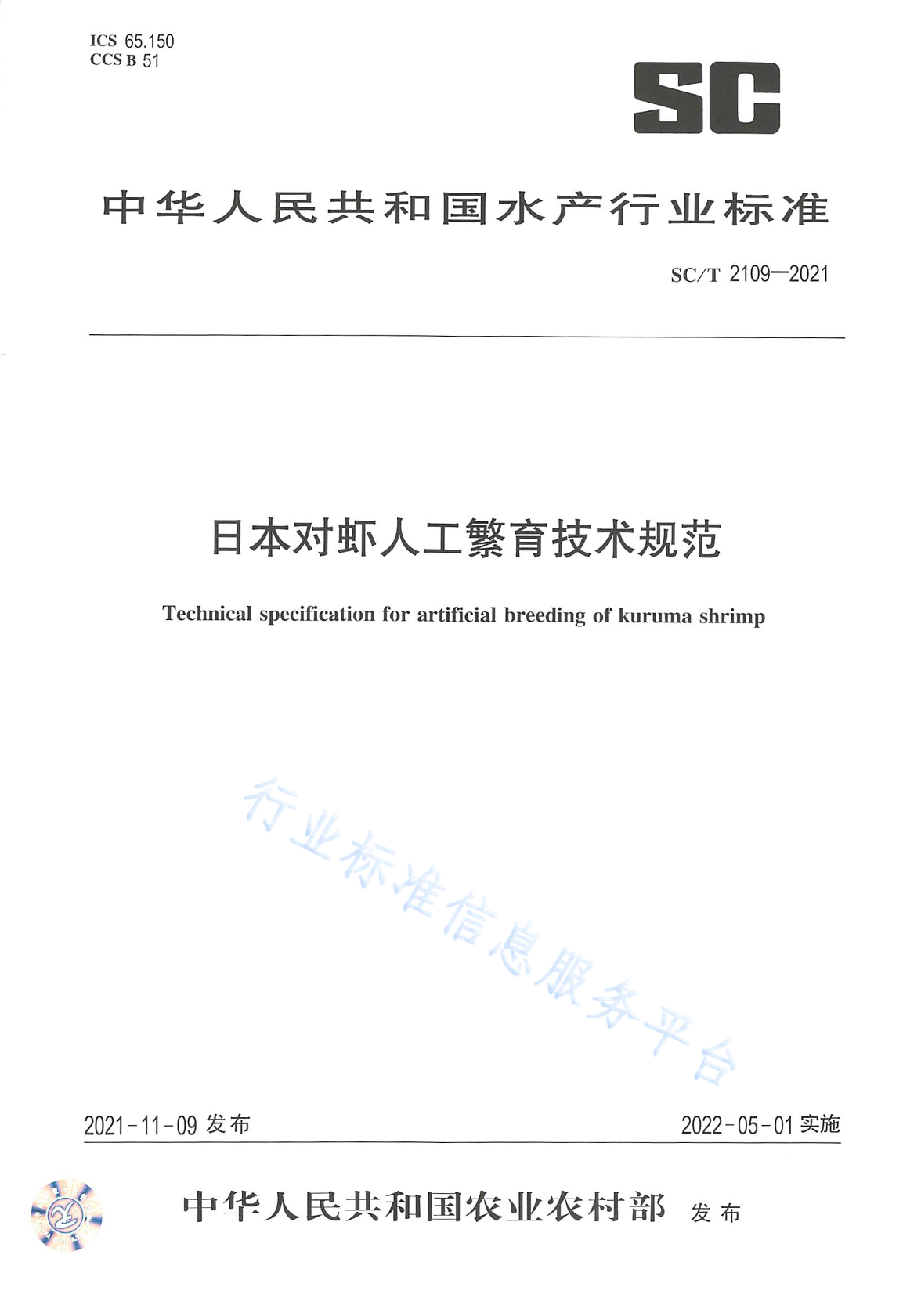 SC/T 2109-2021 日本对虾人工繁育技术规范