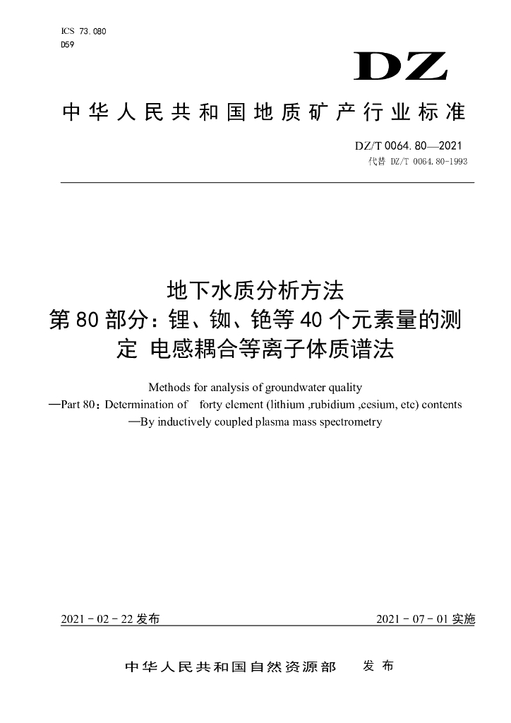 DZ/T 0064.80-2021 地下水质分析方法 第80部分:锂、铷、铯等40个元素量的测定 电感耦合等离子体质谱法