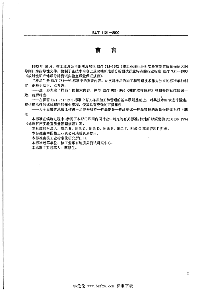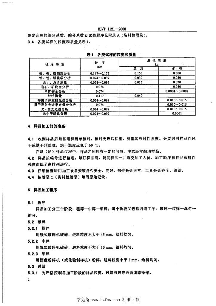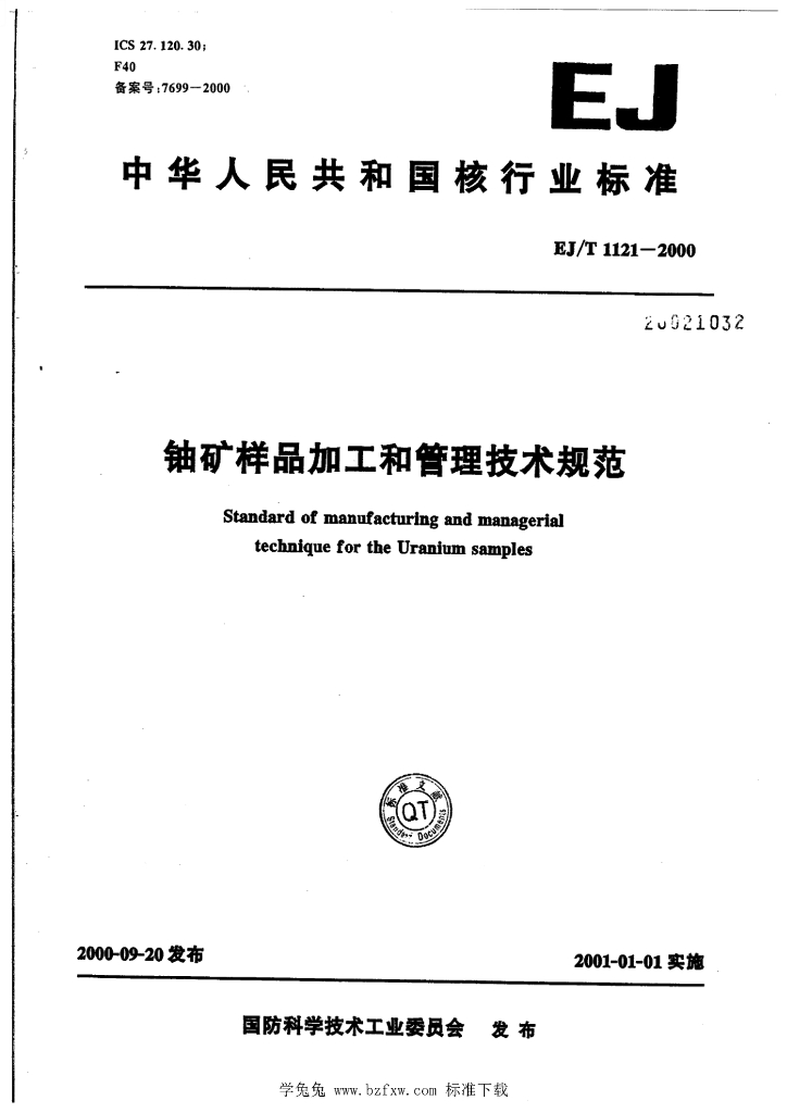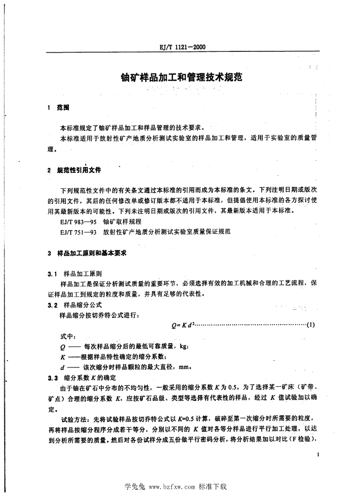 EJ/T 1121-2000 铀矿样品加工和管理技术规范