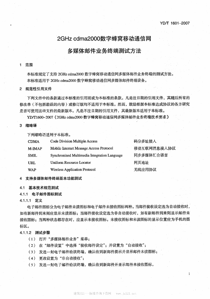 YD/T 1601-2007 2GHz cdma2000 数字蜂窝移动通信网多媒体邮件业务终端测试方法