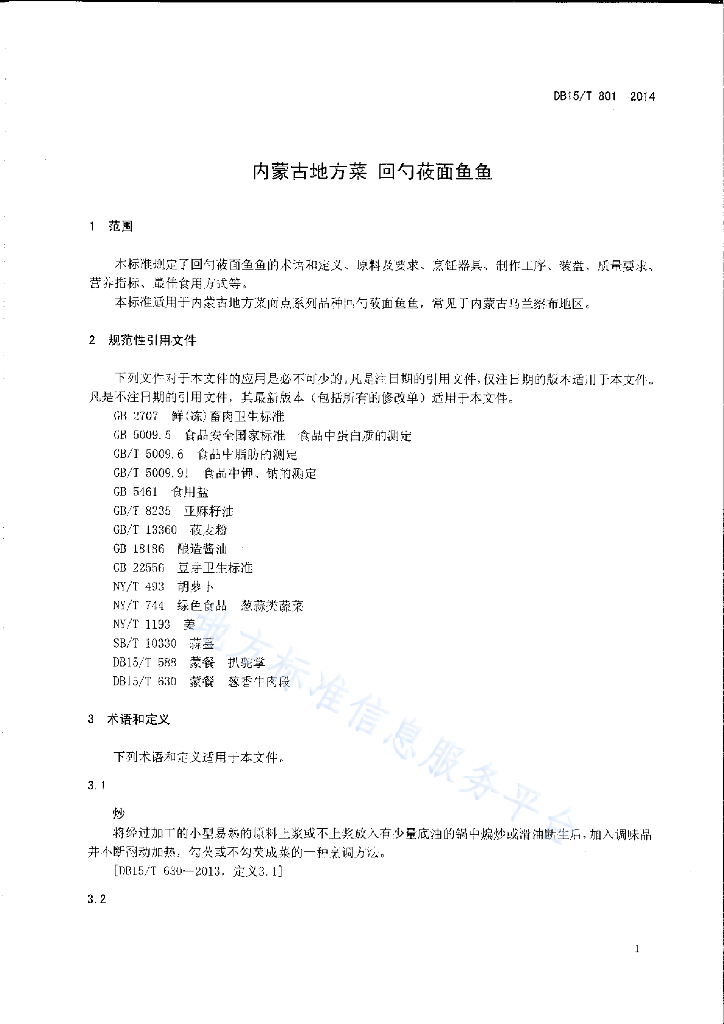 DB15/T 801-2014 内蒙古地方菜 回勺莜面鱼鱼