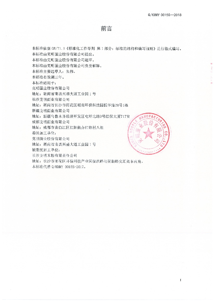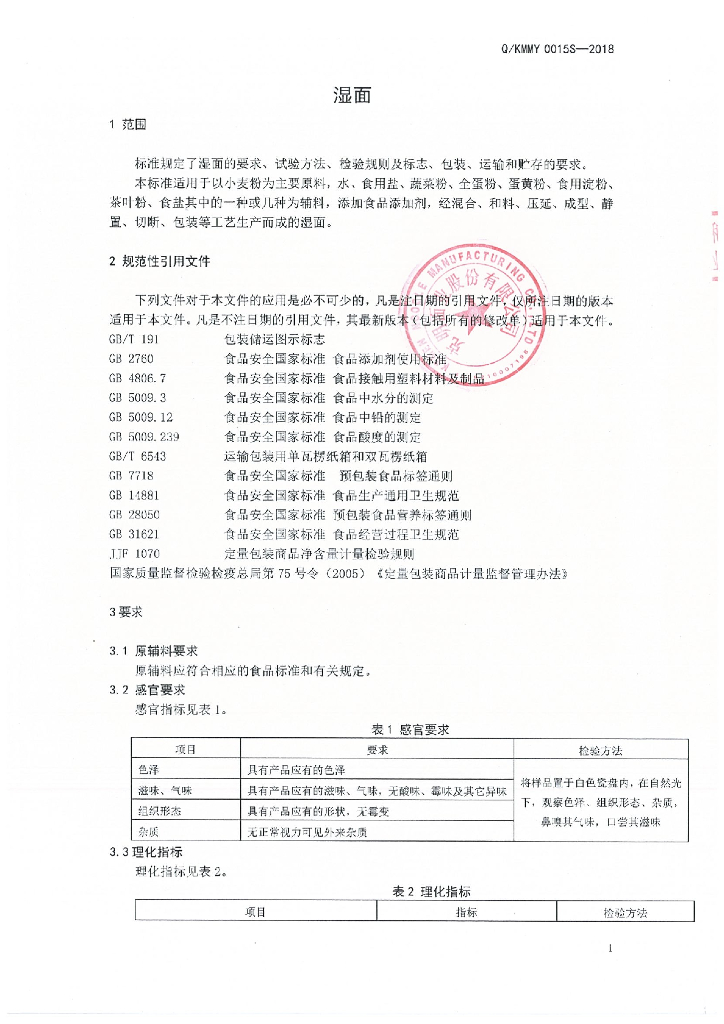 Q/KMMY 0015S-2018 湿面