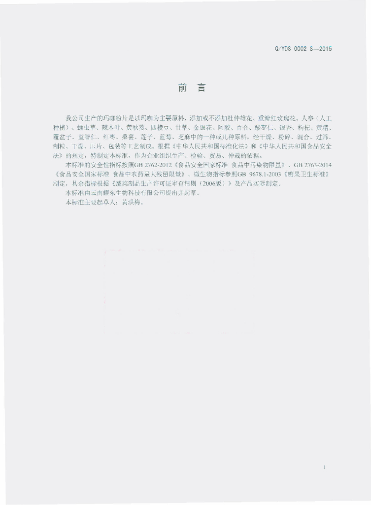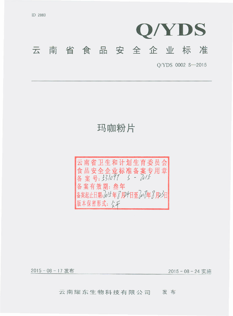 Q/YDS 0002S-2015 云南耀东生物科技有限公司 玛咖粉片
